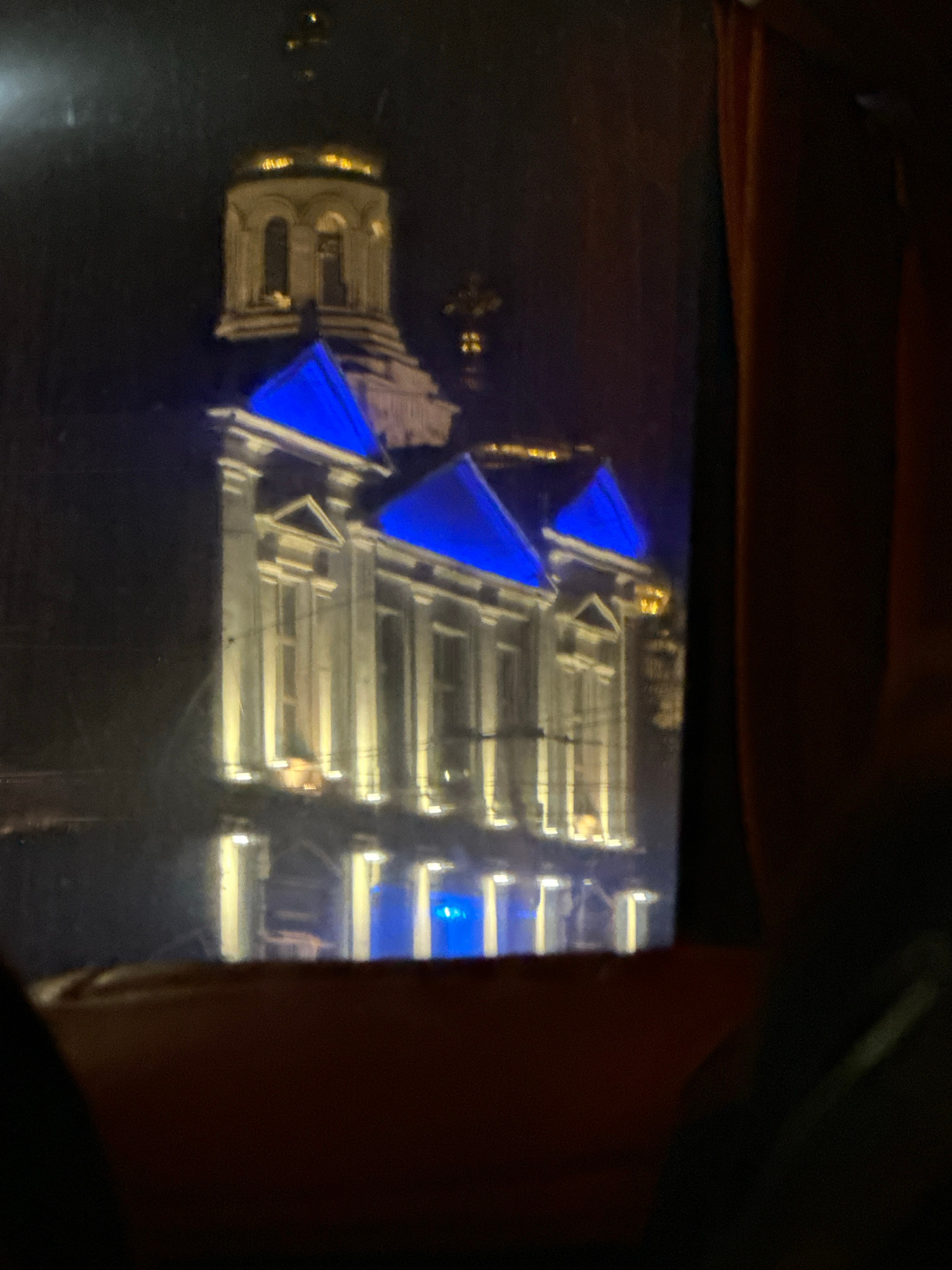 The image shows a reflection of a building at night. It is a white, multi-story building with blue triangular rooftops. The reflection appears to be on a dark, possibly wet surface. The location appea…read more
