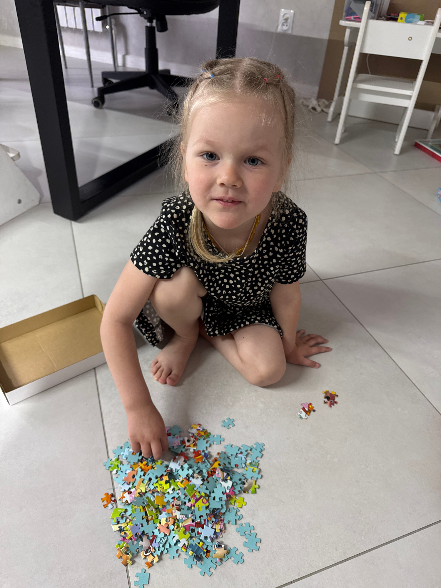 A young blonde girl is captured from an overhead perspective, sitting on a light-colored tiled floor indoors, likely in Gornyi (Dvurechenskoe S/P), Russia. She is wearing a black dress with white polk…read more