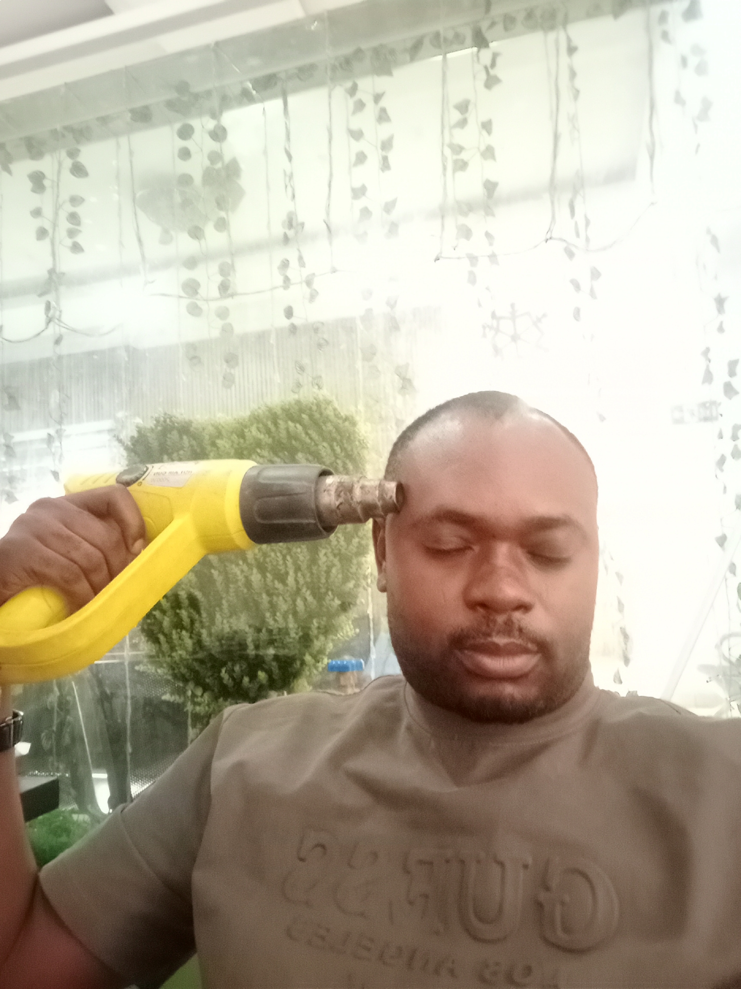 An indoor, vertical shot captures a Black man holding a bright yellow heat gun to his right temple, with his eyes closed. The man has a dark complexion, short hair (with some thinning on top), and a m…read more