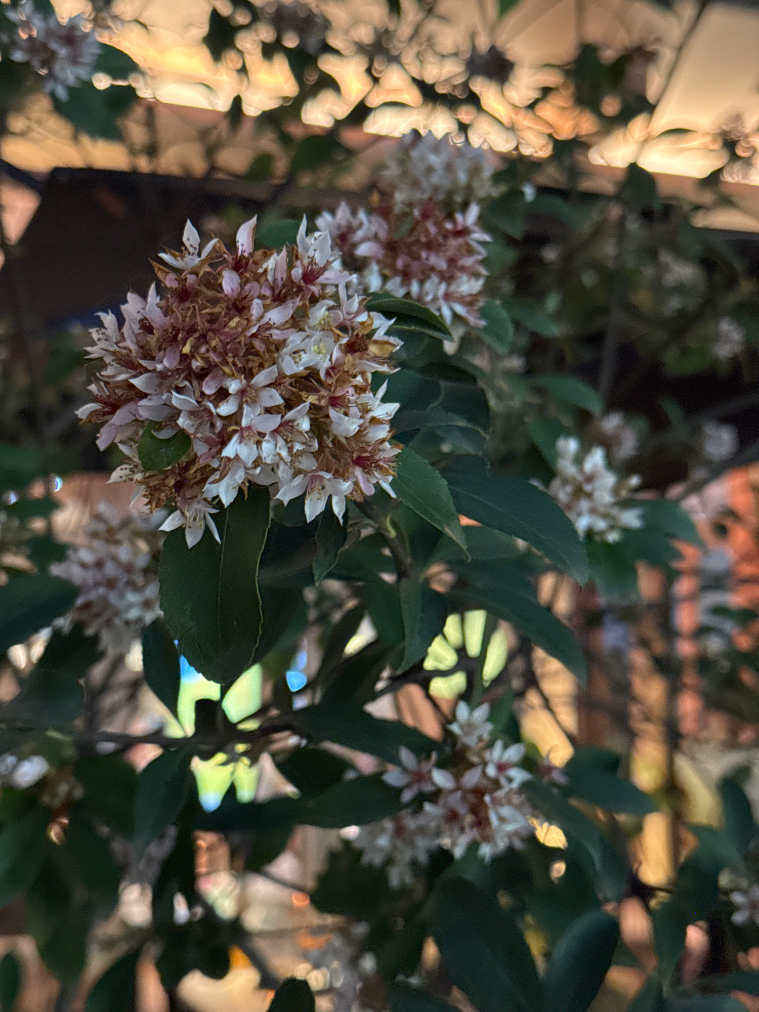 The image shows a close-up of flowering shrubs with dark green leaves. The flowers are small, white with reddish-brown centers, and clustered in bunches. Some flowers appear faded. The background is b…read more