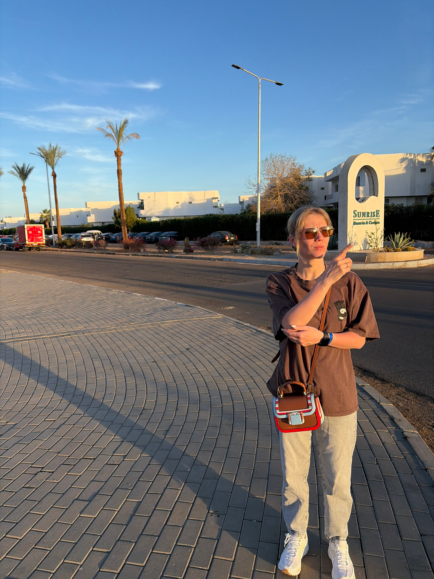 A blonde individual, appearing to be female, stands on a paved sidewalk in Sharm El Sheikh, Egypt. She is oriented towards the right side of the frame, looking towards the left, with her right arm rai…read more