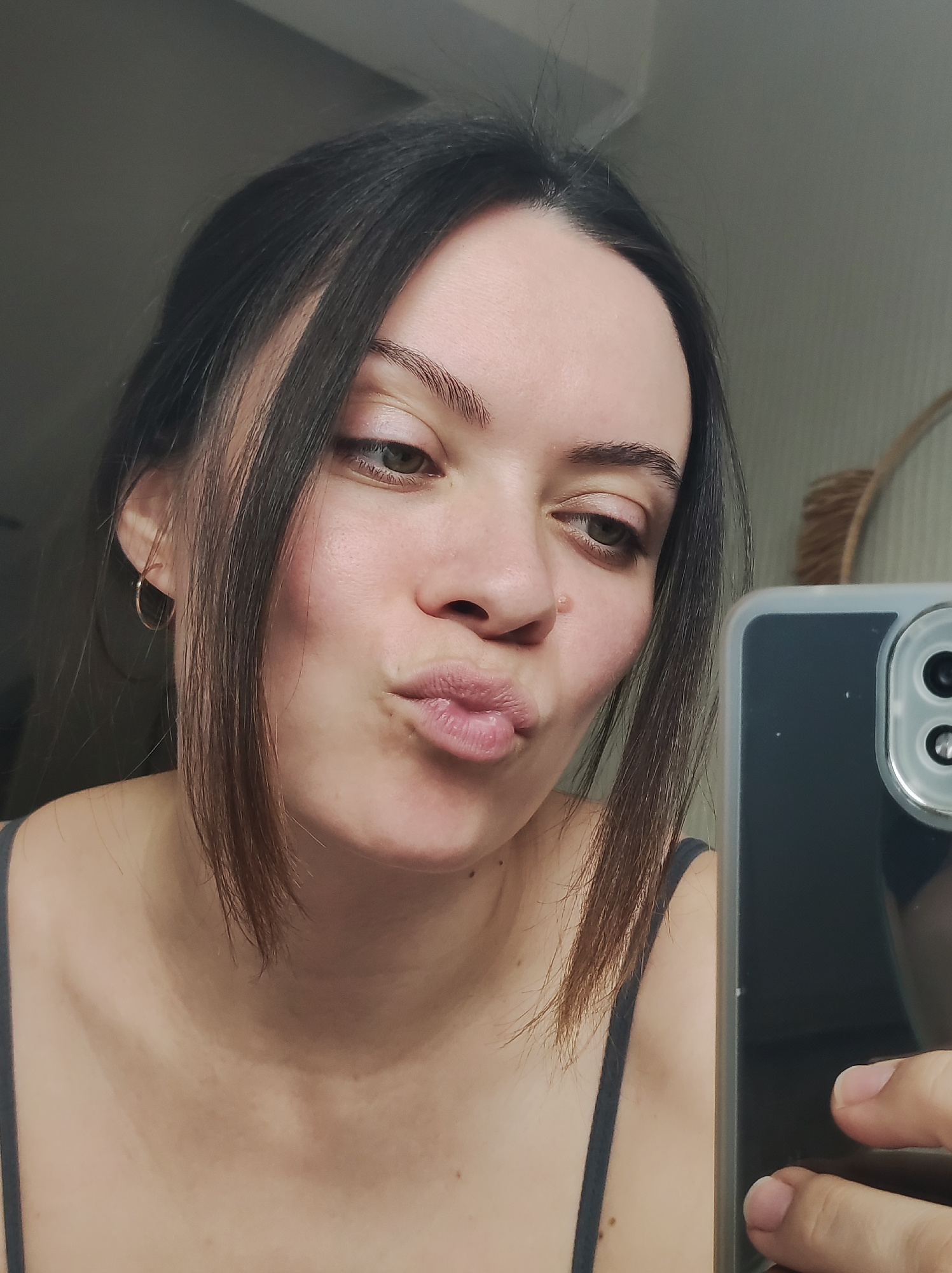 A young woman with dark hair partially pulled back is taking a selfie. She has fair skin, dark eyebrows, and green eyes. Her lips are puckered in a kiss. She is wearing a gray tank top and small hoop…read more