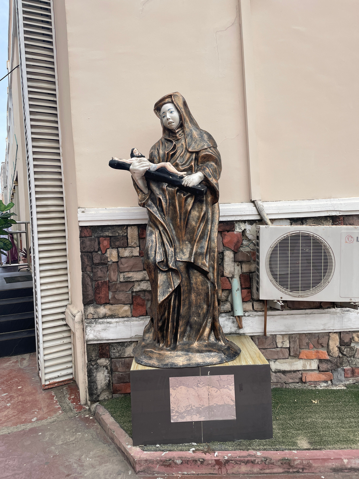 The image shows a statue of a cloaked figure holding a smaller figure, likely a religious sculpture depicting Mary holding Jesus. The statue is positioned on a pedestal beside a building with a cream-…read more