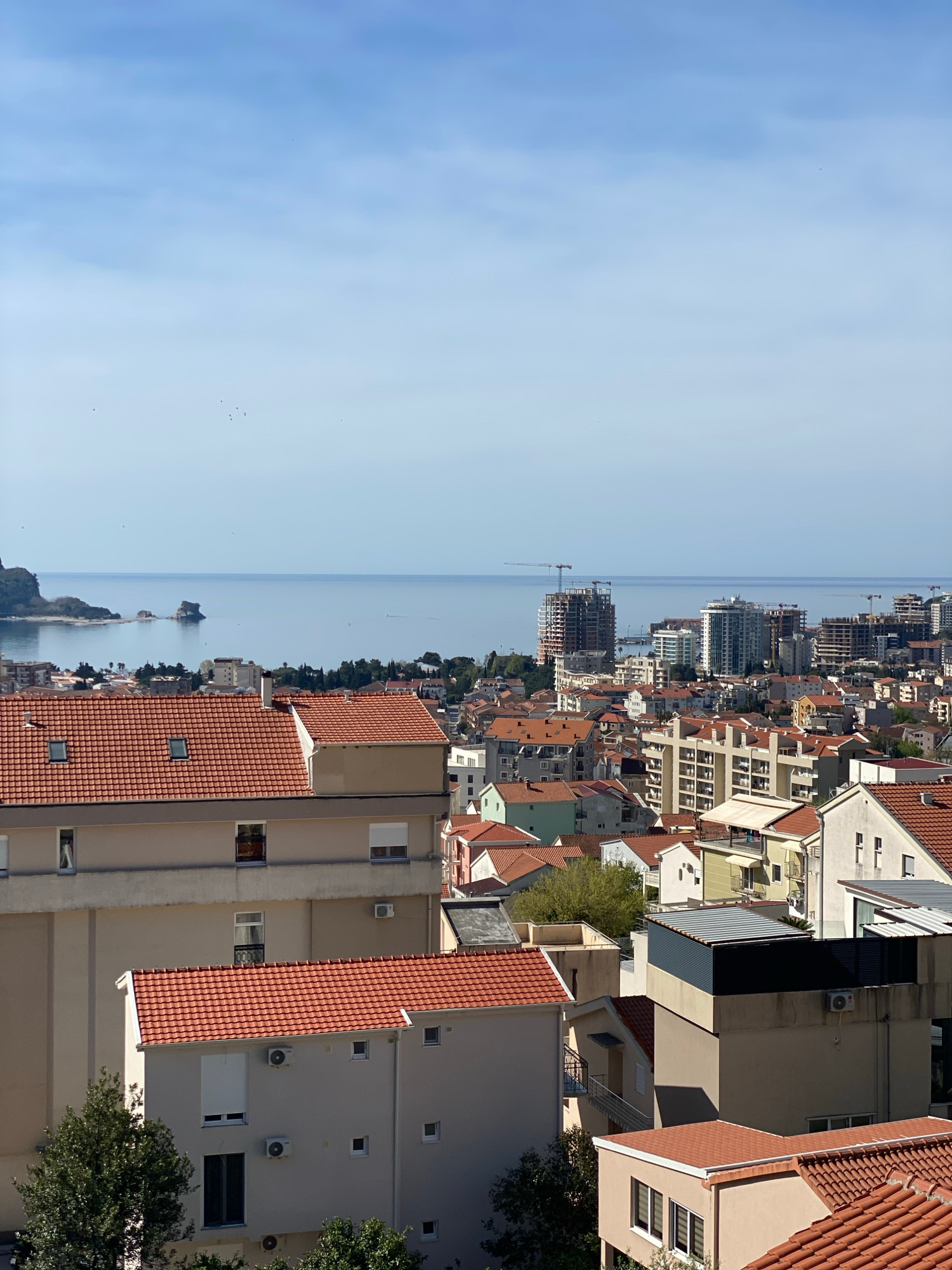 The image depicts an aerial view of Budva, Montenegro, with the Adriatic Sea on the left and the city's buildings on the right. The buildings are primarily residential with red-tiled roofs, interspers…read more