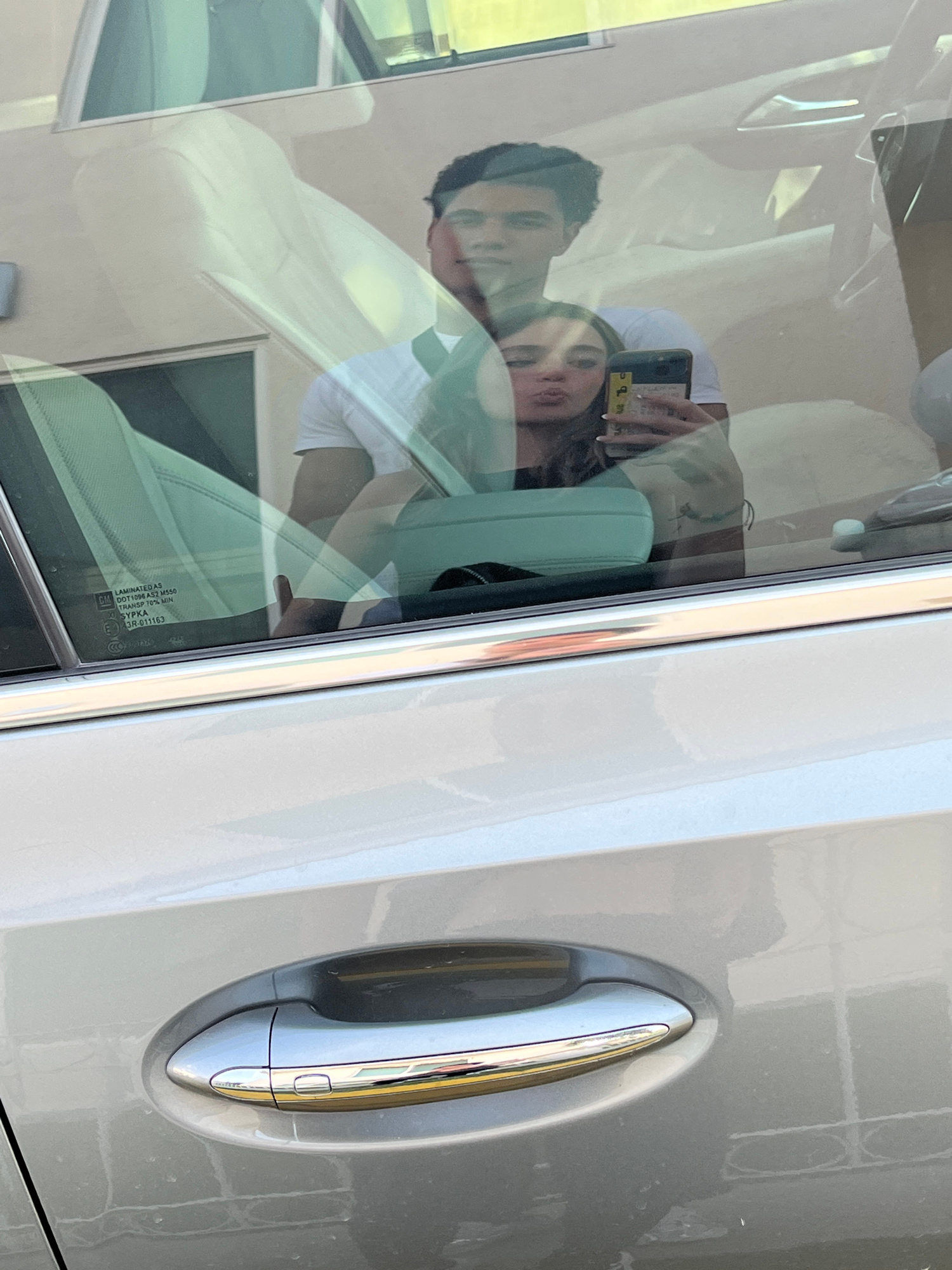 A couple is reflected in the window of a parked car. The man is on the left, wearing a white t-shirt. The woman is on the right, holding a mobile phone, and the camera is directed towards them. The ve…read more