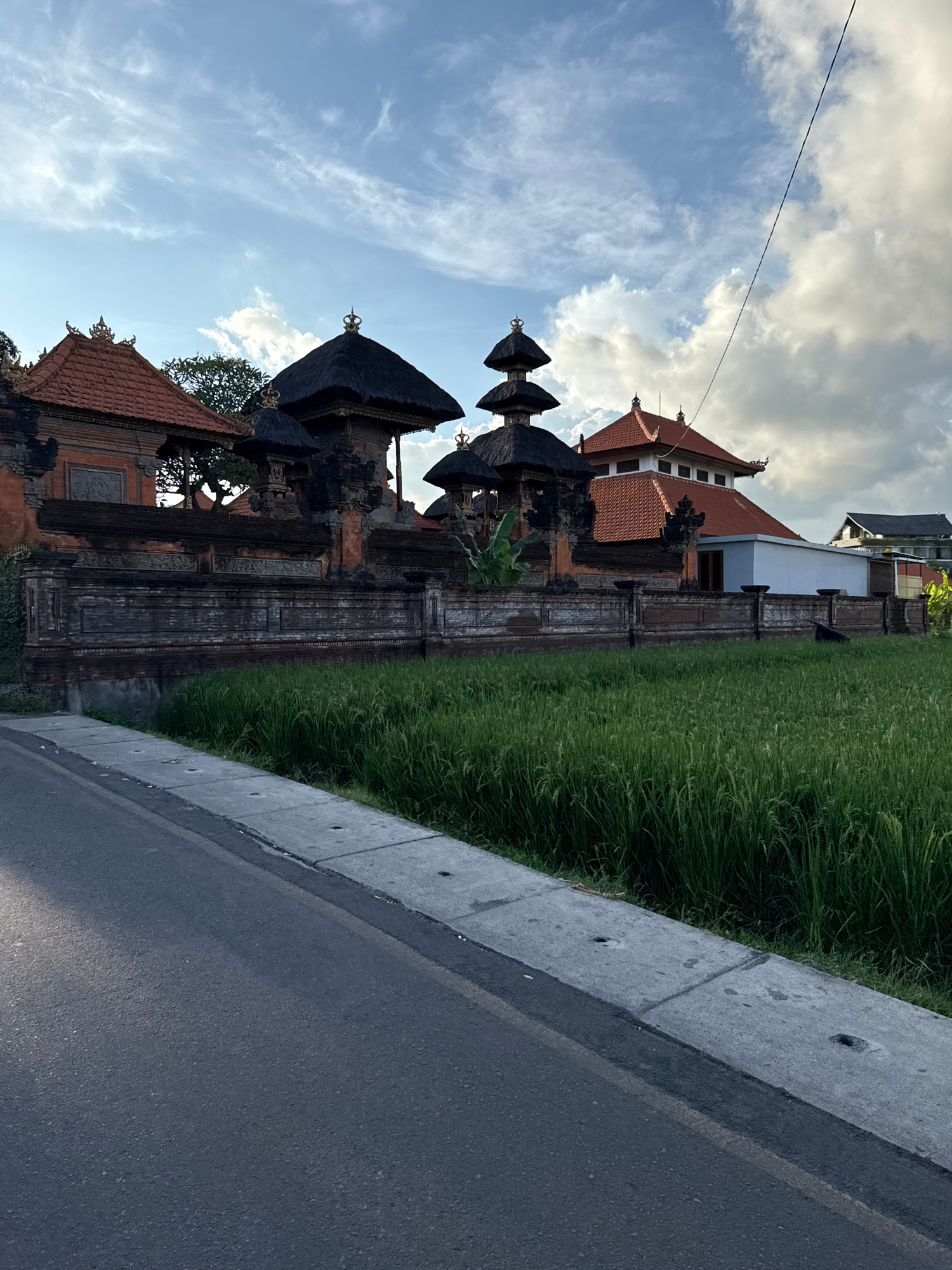 This media file captures a scenic view in North Kuta, Indonesia, featuring traditional Balinese architecture, lush greenery, and a roadside. On the left side of the frame, a complex of buildings is vi…read more