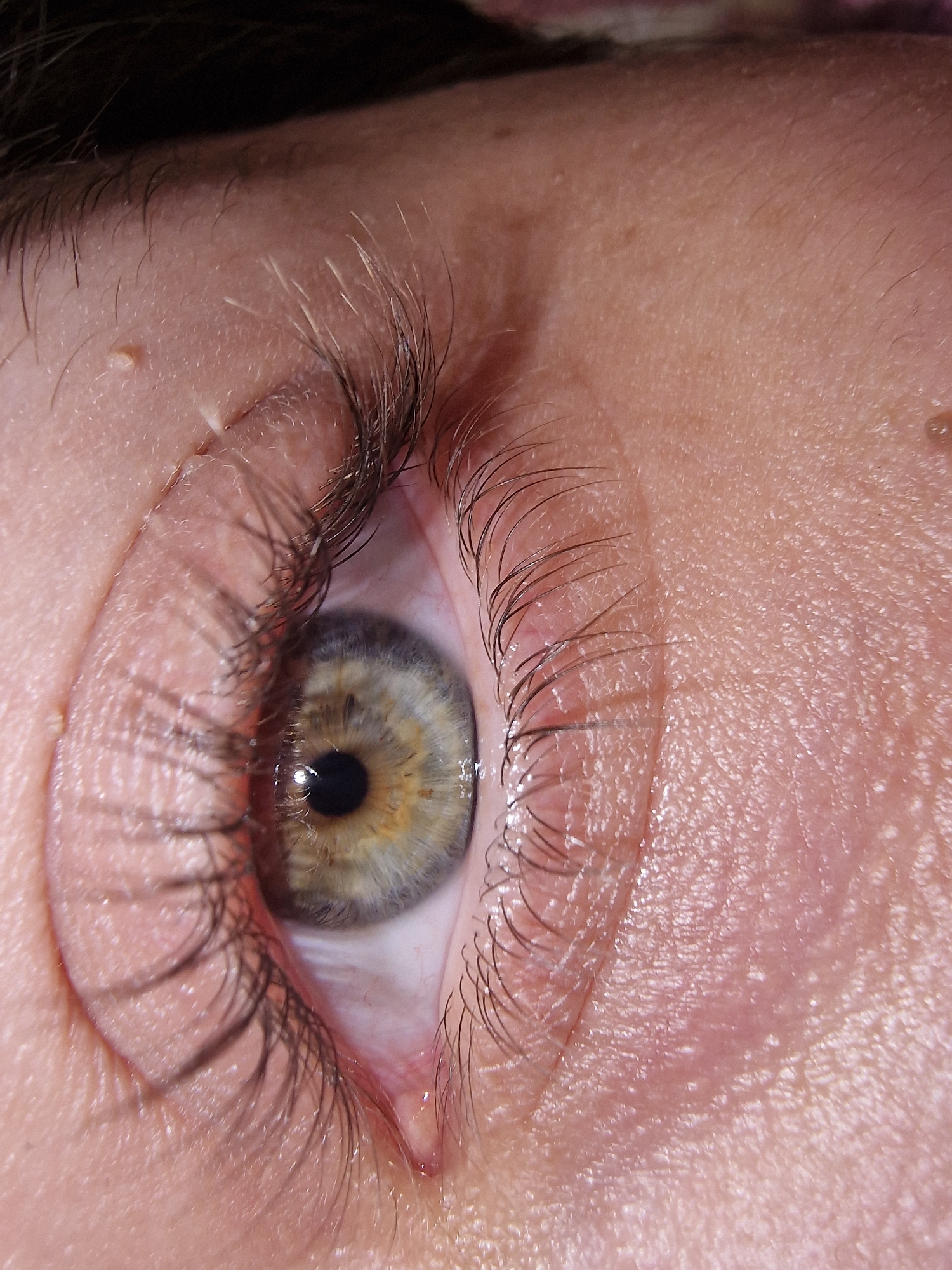 A macro, close-up shot captures a human eye. The eye, appearing to belong to an adult, is wide open and gazes directly forward. The iris exhibits central heterochromia, featuring a distinct golden-bro…read more