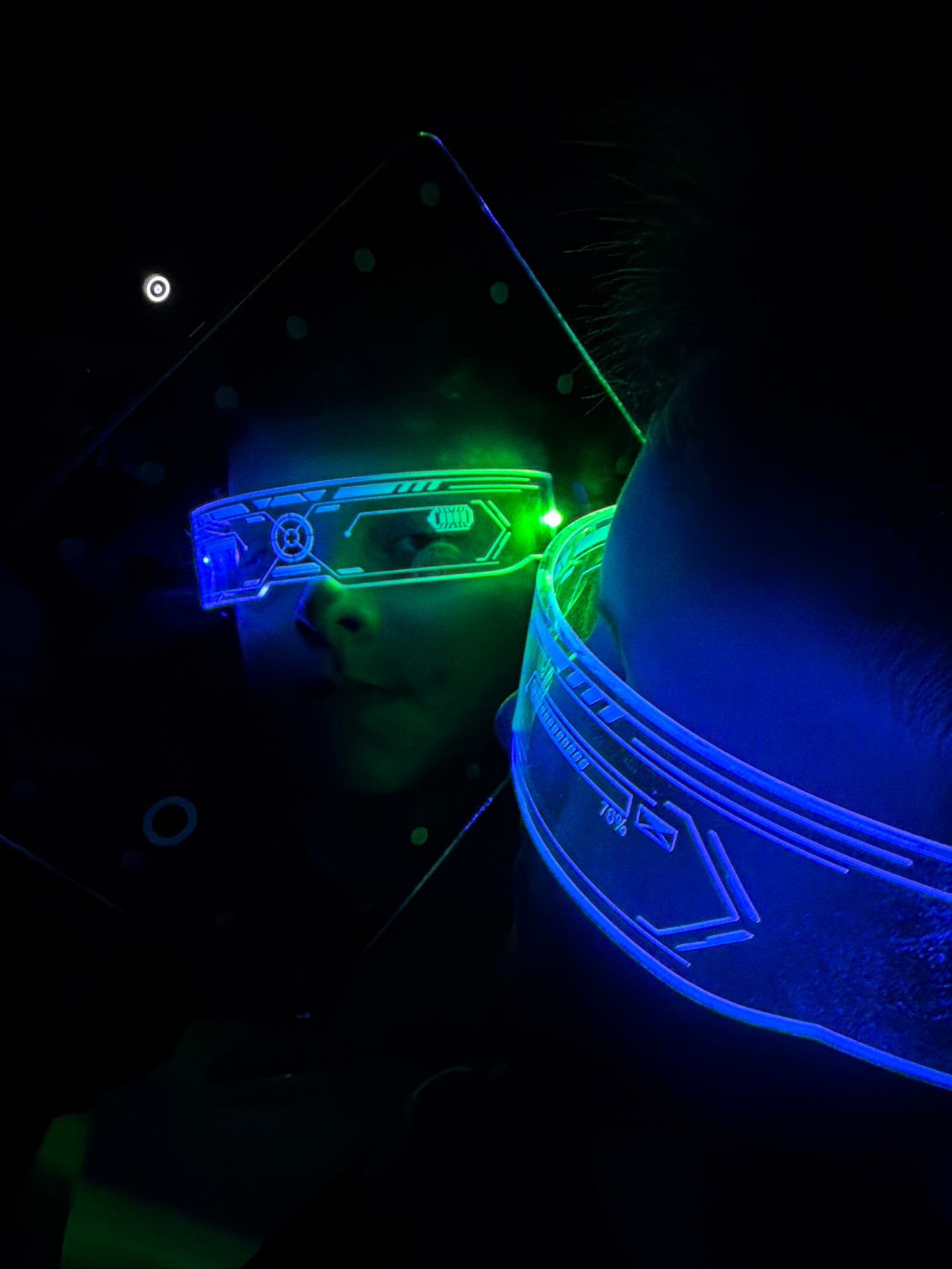 A close-up shot in a dark environment features a child's face illuminated by two glowing, transparent objects with futuristic designs. The upper object, curved and blue, rests against the child's fore…read more