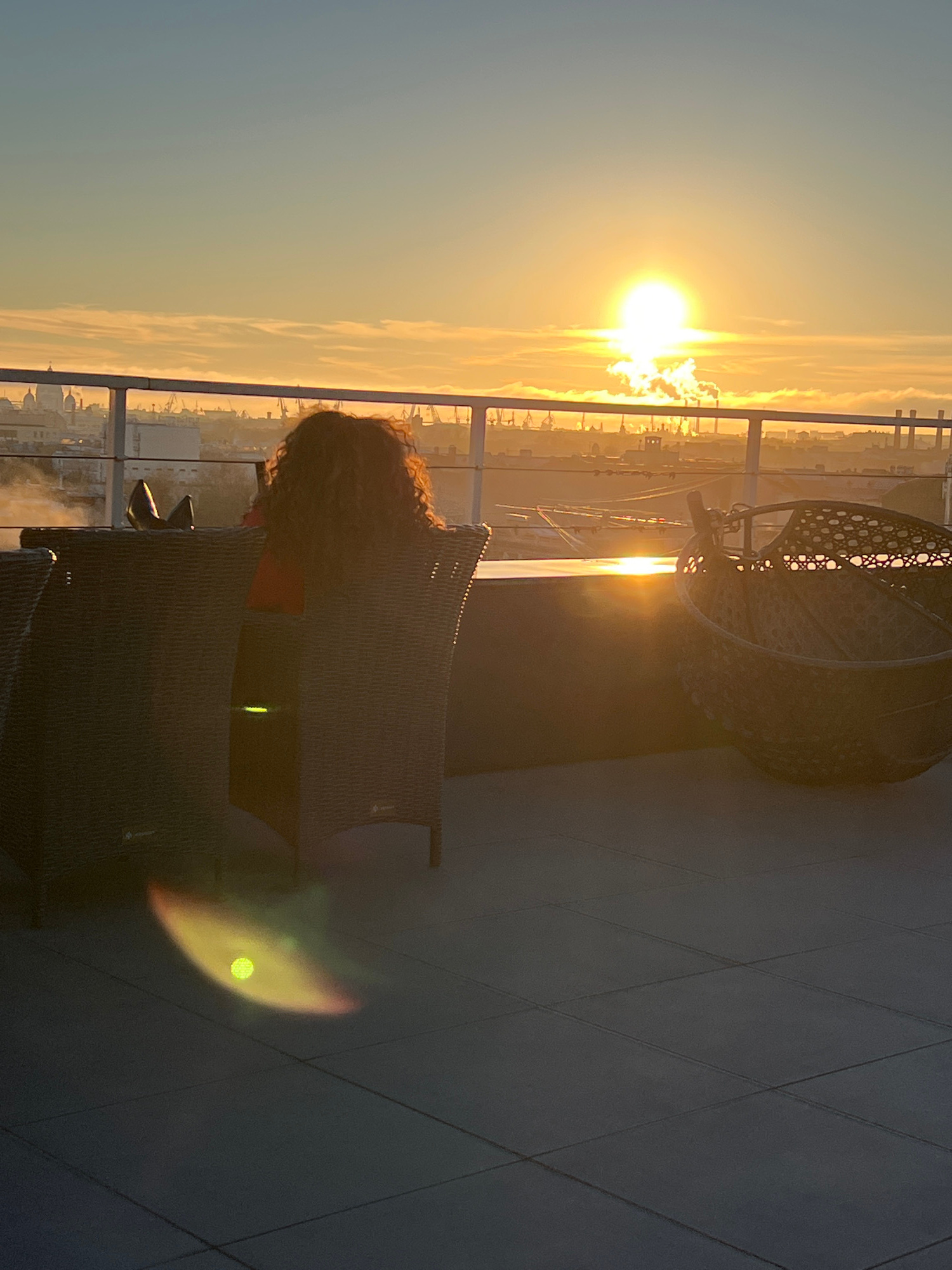 A person with curly hair sits in a wicker chair on a balcony overlooking the city of Saint Petersburg, Russia. The sun is setting over the city, casting a golden glow. A hanging chair is in the backgrโฆread more