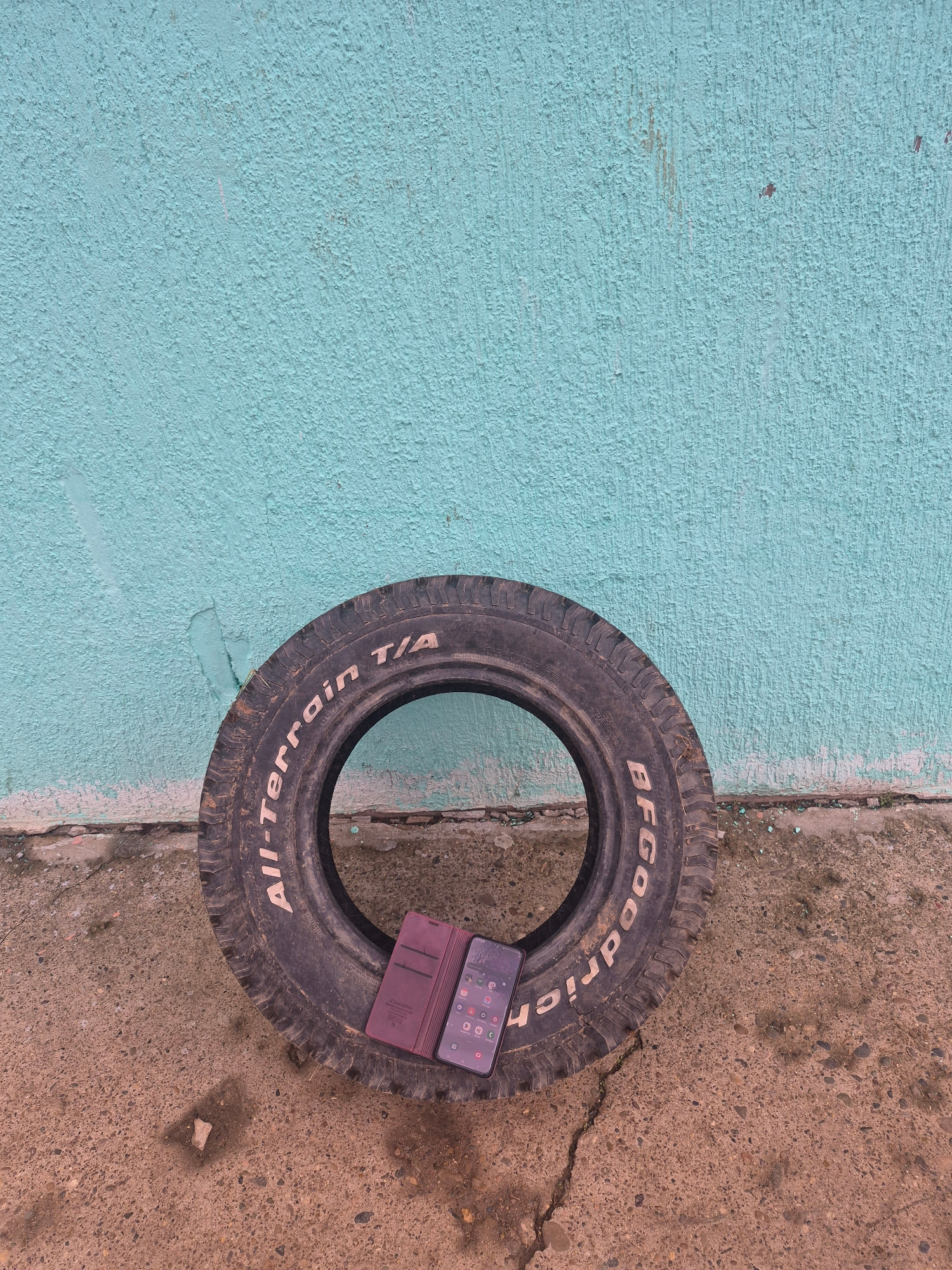 The image shows a discarded BFGoodrich All-Terrain T/A tire lying on a surface that transitions from a light blue textured wall on the left to a worn, mottled concrete surface on the right. A smartpho…read more