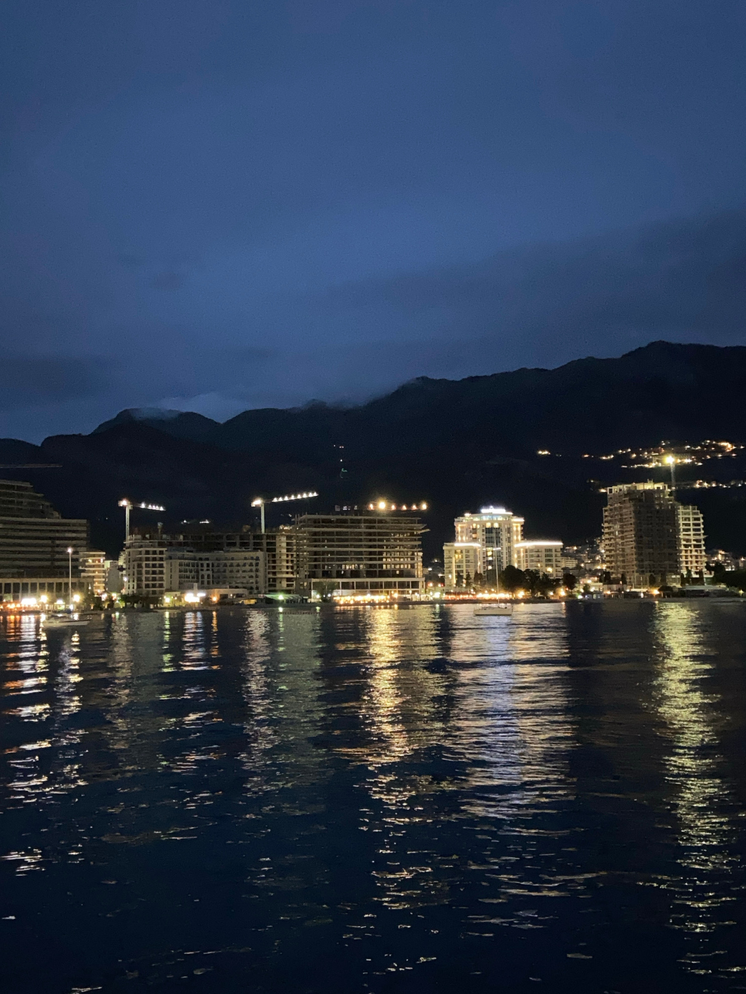 The image depicts a nighttime scene of the Budva skyline in Montenegro, reflected in the water. The city is situated at the base of a dark, mountainous landscape. Building lights illuminate the city,…read more