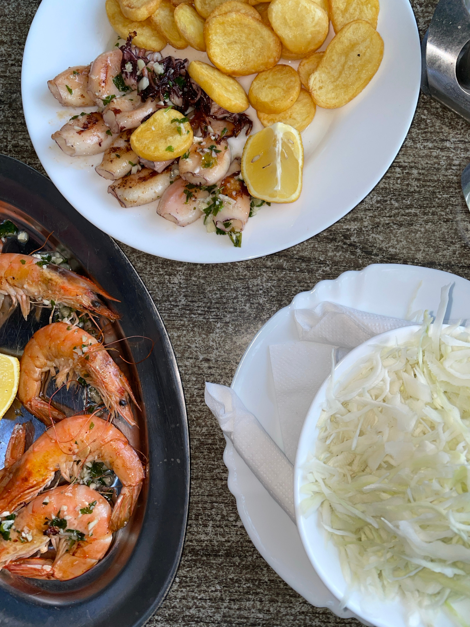 A top-down shot showcases a meal arrangement on what appears to be a rough, gray textured surface, possibly a table. Three plates of food are present. A white plate on the left contains fried potato sā¦read more