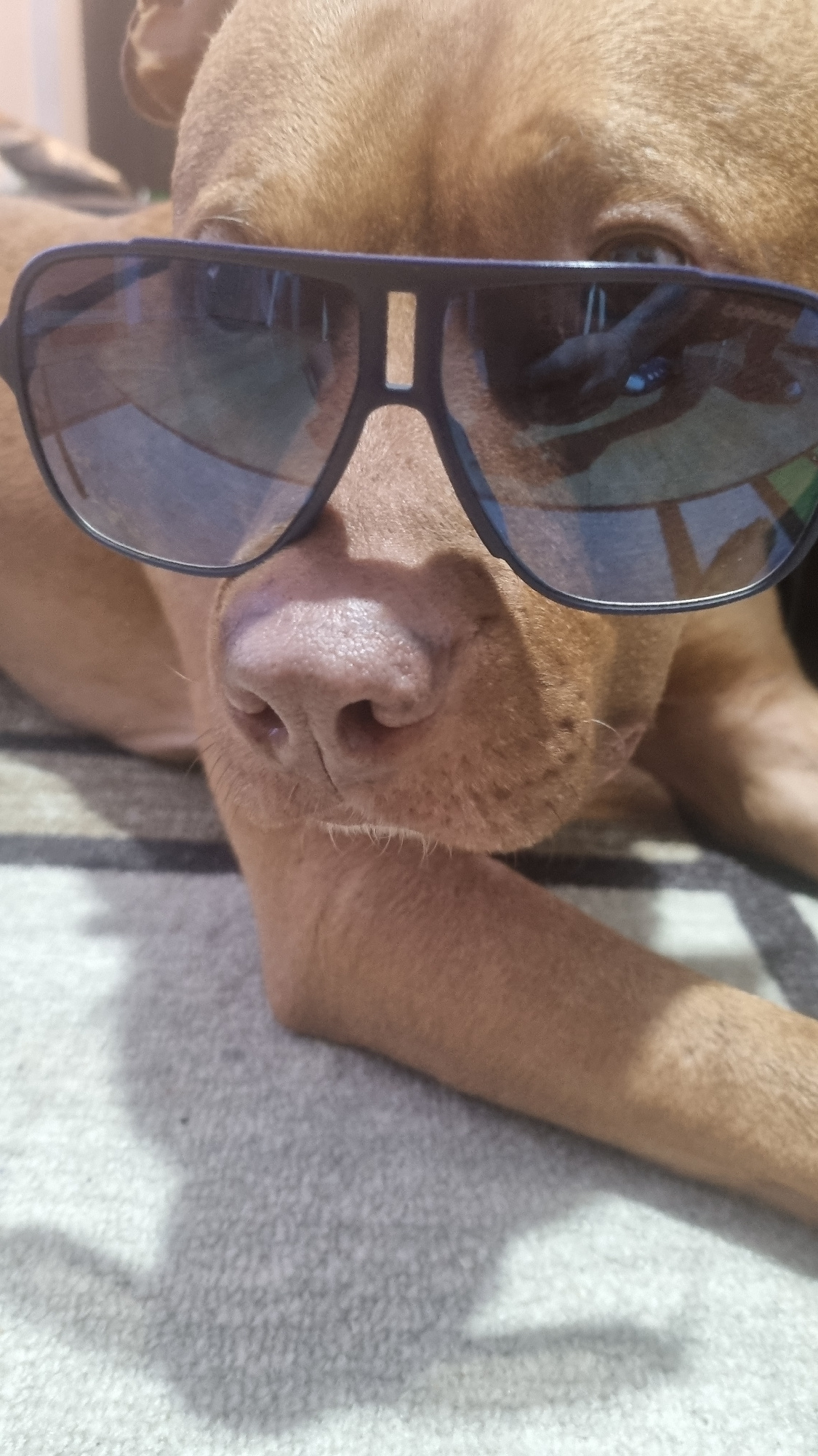 A close-up shows a fawn-colored dog with short hair, wearing sunglasses, resting on a light gray and white striped fabric. The dog's nose is prominent, and one eye is visible. The sunglasses have blac…read more