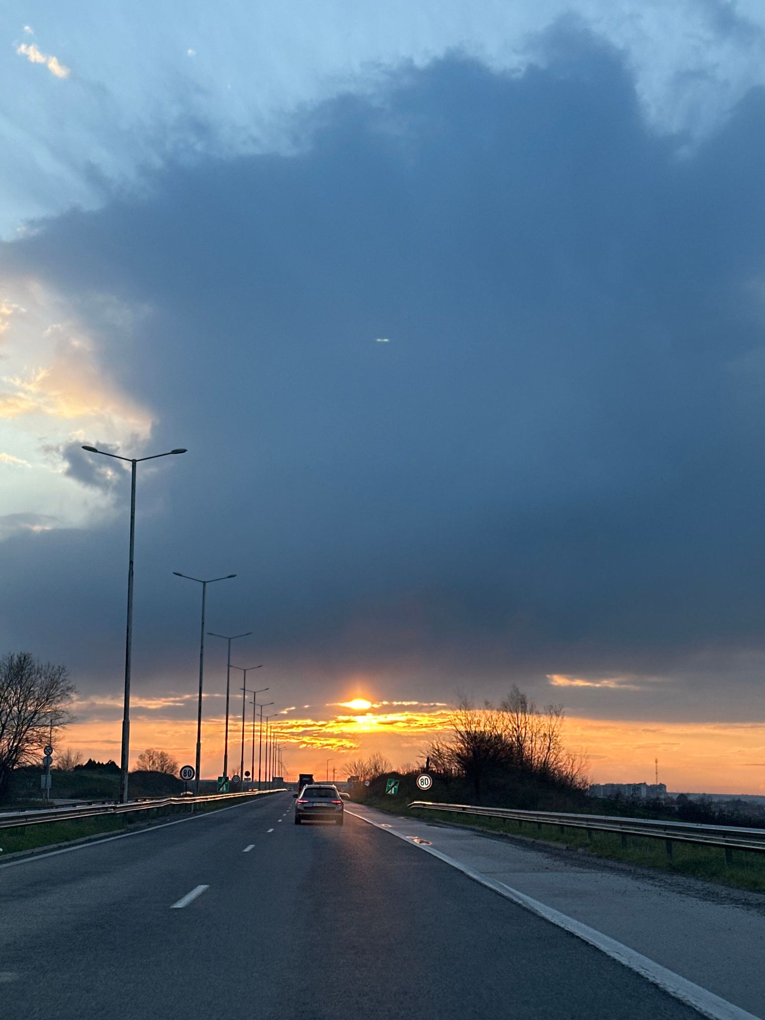 The image depicts a highway near Svilengrad, Bulgaria, at sunset. The road is wet and lined with streetlights. A car is traveling on the highway, heading toward the sun. Dark clouds fill much of the s…read more
