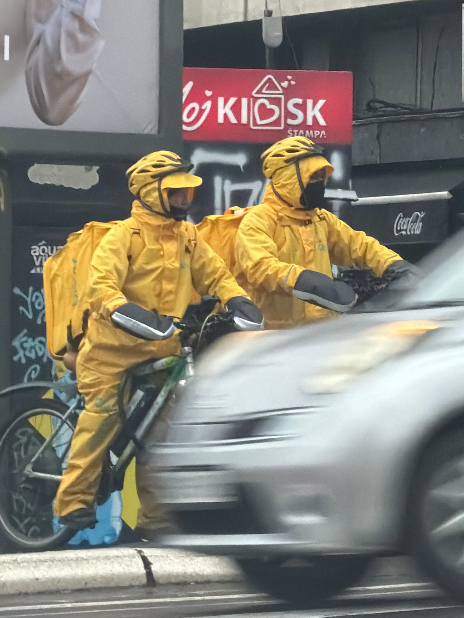 Two individuals wearing matching bright yellow full-body rain suits, including hooded jackets and pants, are visible in an urban street scene in Belgrade, Serbia. The person on the left wears a yellow cycling helmet over their hood and a black face covering, and is positioned astride a bicycle with a dark green frame, holding its handlebars. A large, square, yellow delivery backpack is strapped to their back. The person on the right is similarly dressed in a yellow rain suit with a black face covering and is also on a bicycle, partially obscured by a light-colored, blurred vehicle in motion passing diagonally through the foreground from right to left. Both individuals wear black gloves, with some featuring silver accents. The background elements include a prominent red sign with white text that reads "Moj KIOSK ŠTAMPA" and features a house-and-heart logo. Below this, a black sign displays a white "Coca-Cola" logo. To the left, a dark wall or shutter is covered in white graffiti, including the partially visible text "aqua Vi". A large, light-colored billboard with an indistinct image of drapery or a garment is positioned in the upper left of the frame. The scene is observed at street level, with a concrete curb separating the subjects from the blurred road surface. | Open Wire