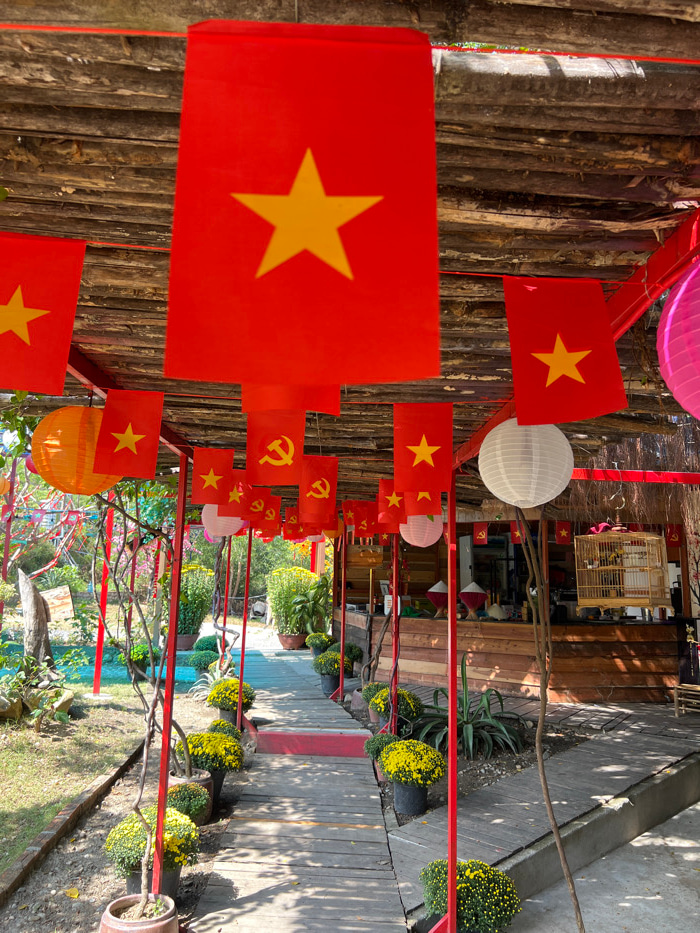 A festive outdoor setting is adorned with strings of Vietnamese flags, lanterns, and red supports. Yellow and green potted plants line a walkway that transitions from wood to concrete. A birdcage is v…read more
