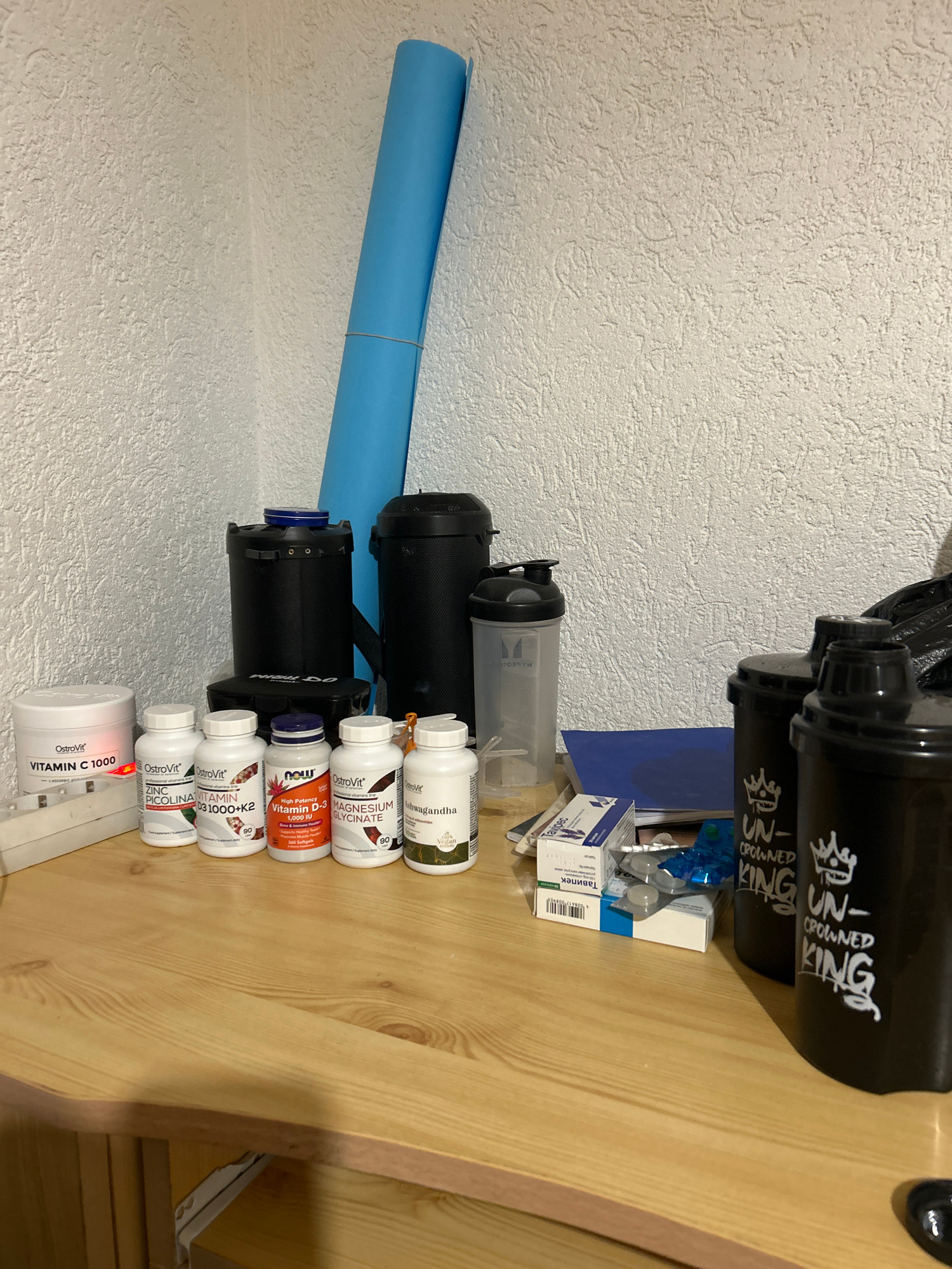 The image shows a collection of objects on a wooden surface. The objects include several black shaker bottles, some labeled "UN-CROWNED KING," and a clear shaker bottle. There are also multiple contai…read more