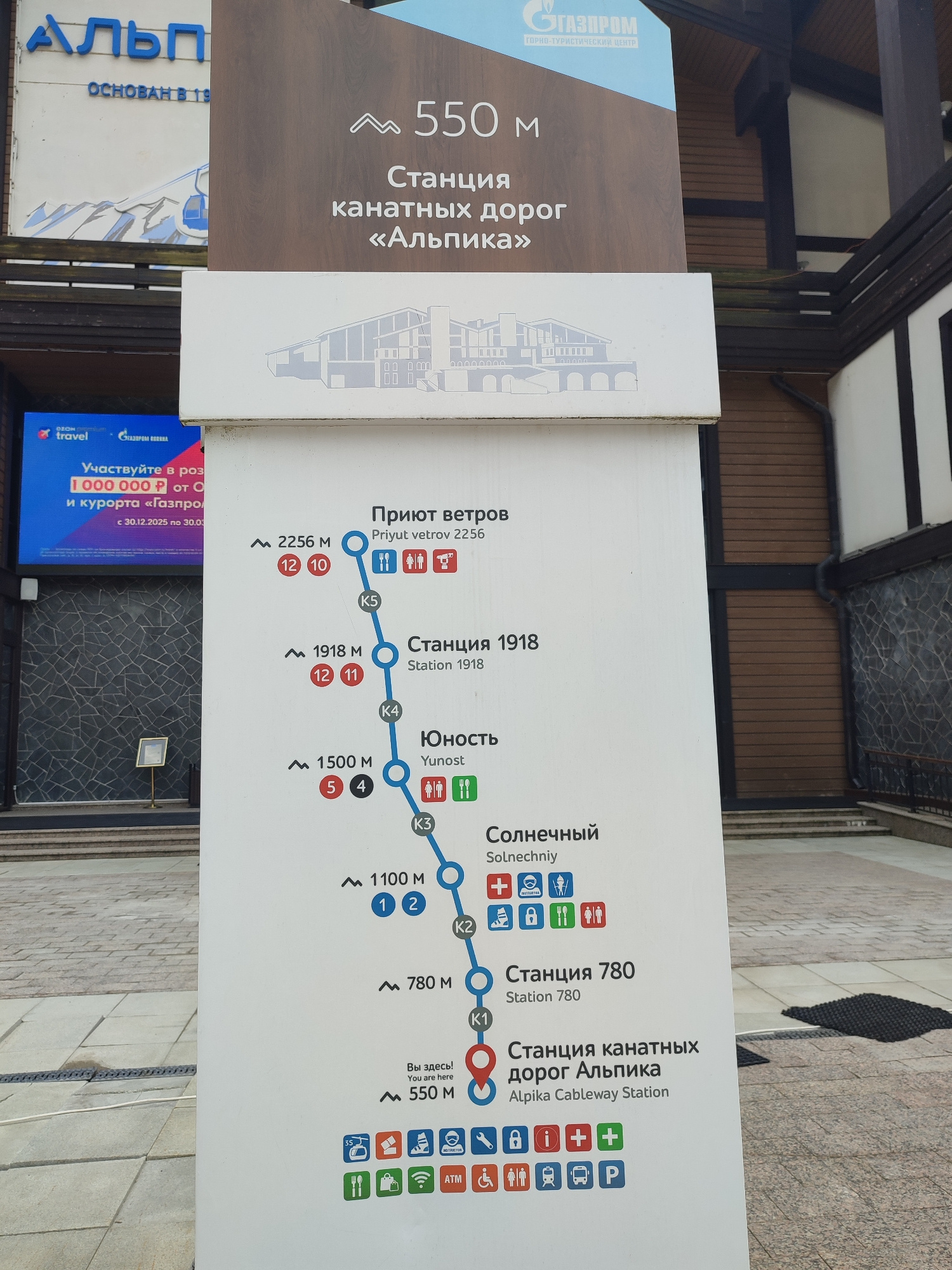 The image shows a signpost in Estosadok, Russia, detailing the stations along the Alpika Cableway. The signpost is predominantly white with a brown header. It displays a schematic of the cableway routβ¦read more