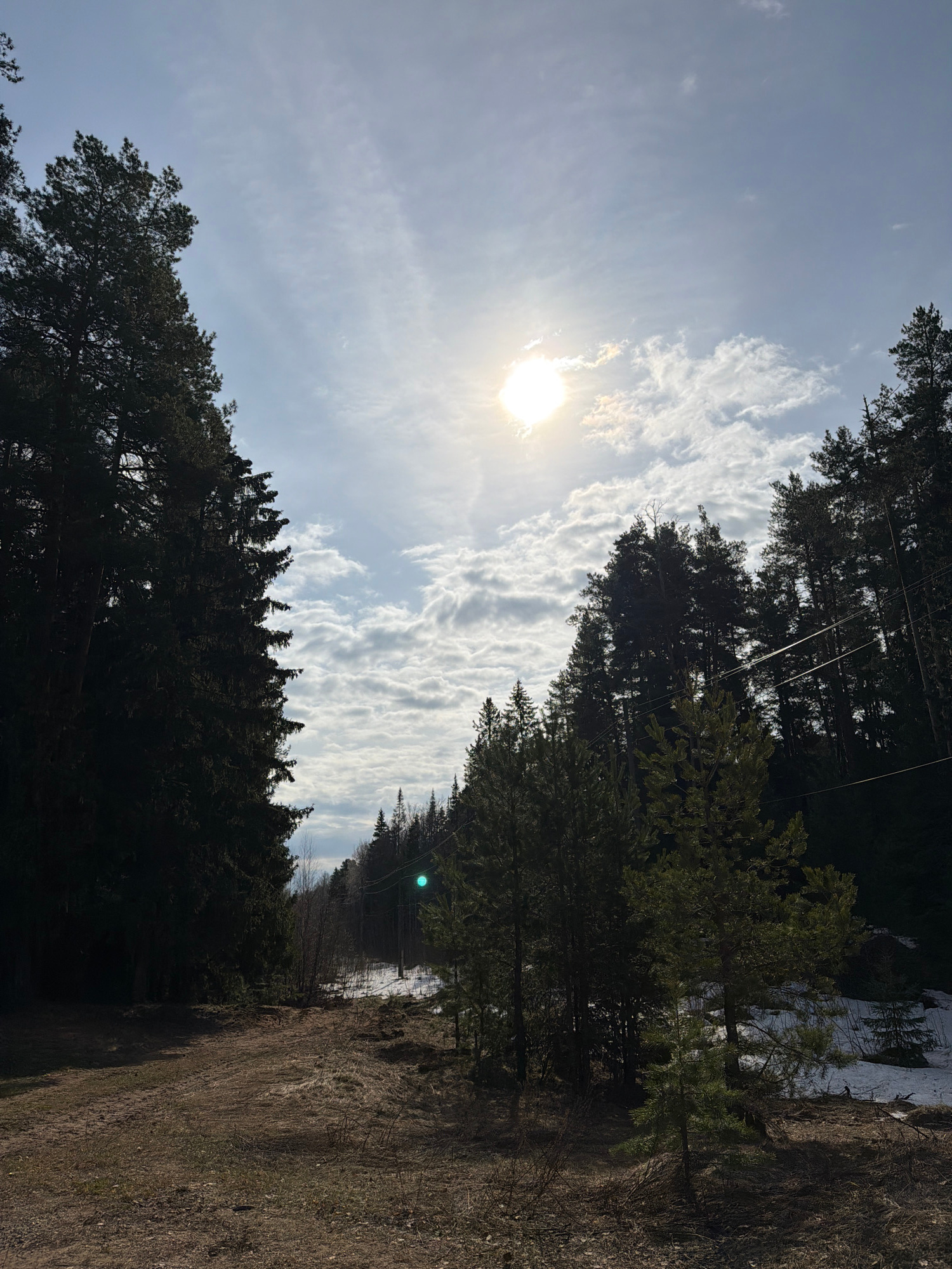The image depicts a forest path on a sunny day in Chaikovsky, Russia. The sky is a light blue with scattered white clouds, and the sun is visible in the upper left portion of the frame. Tall evergreenβ¦read more