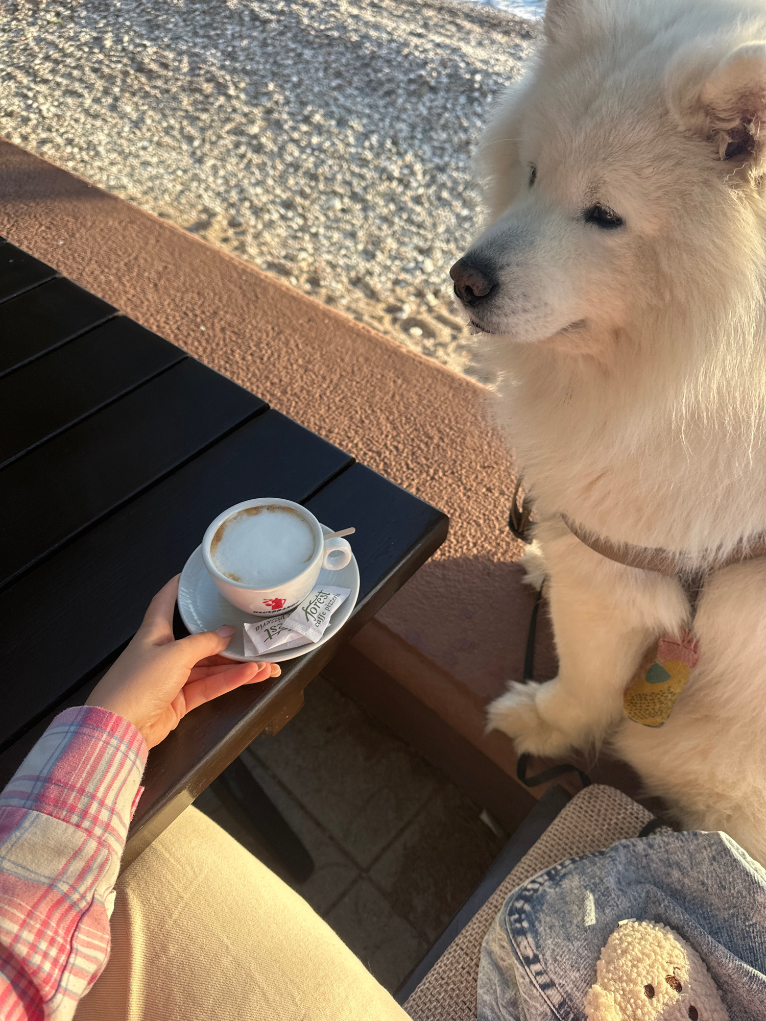 A person wearing a pink and white plaid shirt is holding a white cup of coffee with sugar packets on a saucer on a black wooden table. A white Samoyed dog is next to the table, wearing a brown harnes…read more