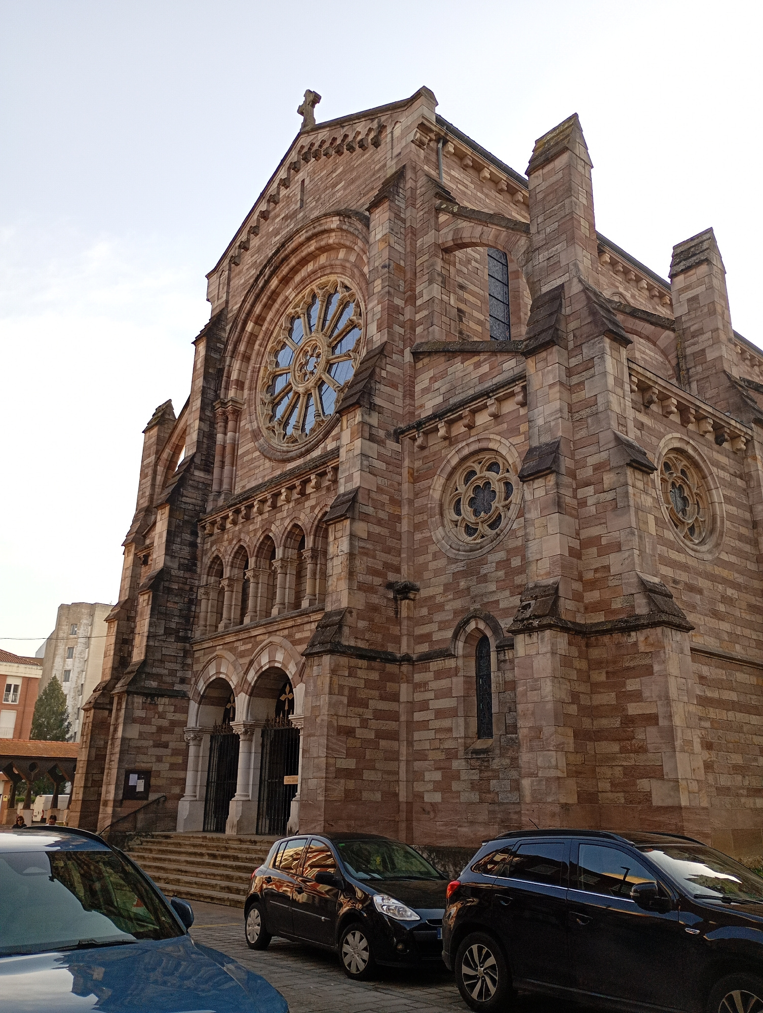 The image depicts the facade of the Iglesia de la Asunción (Church of the Assumption) in Torrelavega, Spain. The church, constructed of reddish-brown stone, displays notable Romanesque architectural e…read more