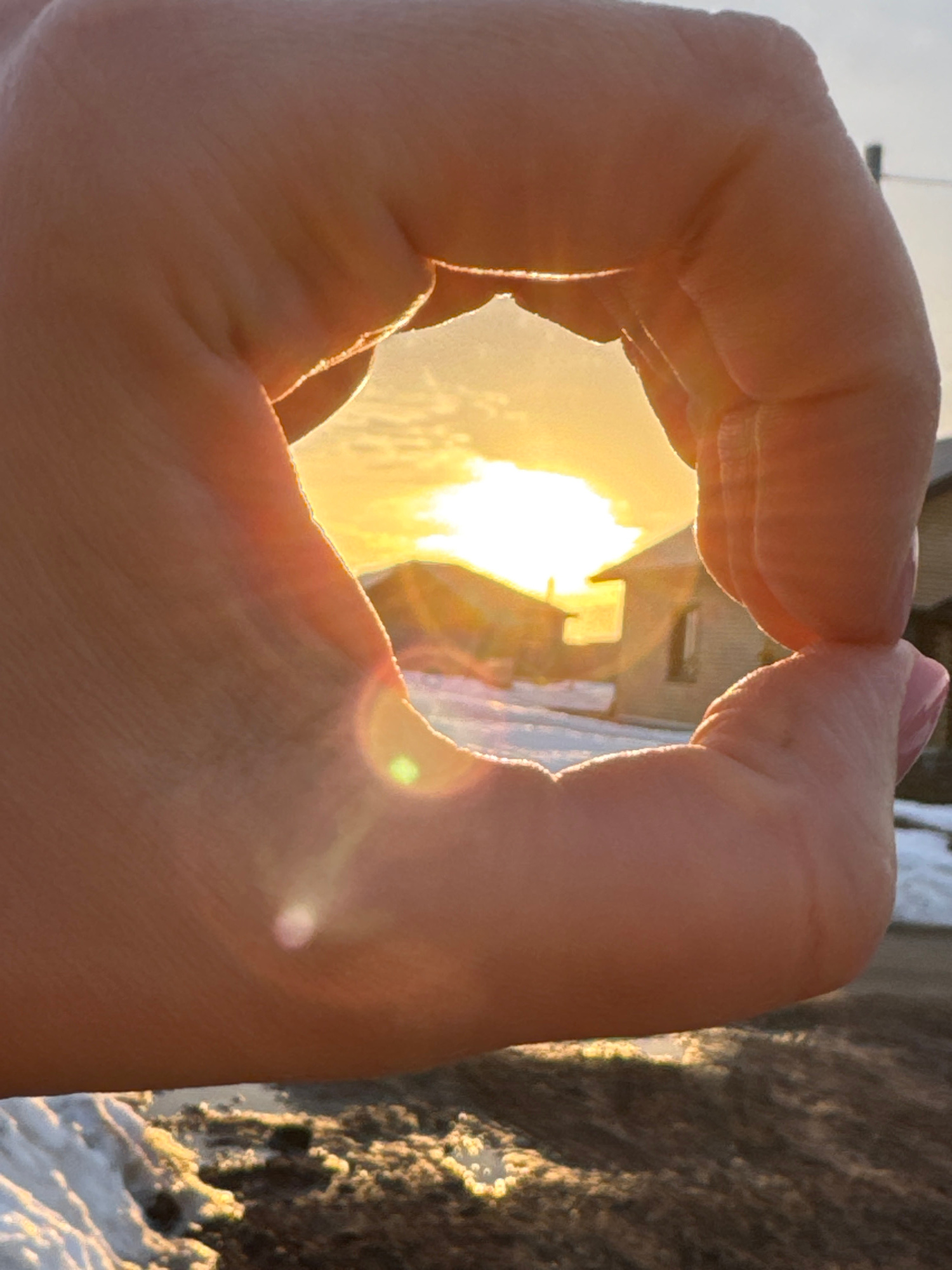Here's a description of the image: The image shows a person's hand forming a circle, with the setting sun visible through the opening. The sun is bright, causing a lens flare. Through the circle, a b…read more