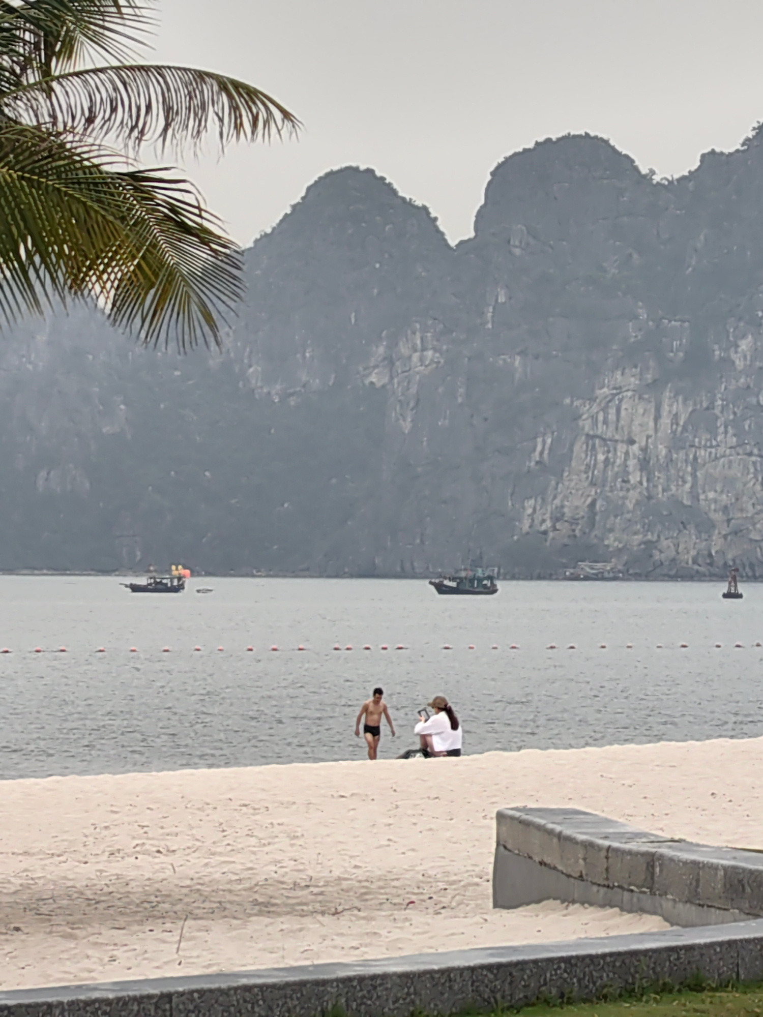 The image depicts a beach scene in Ha Long Ward, Vietnam. In the foreground, a sandy beach stretches toward the water, with a concrete retaining wall at the bottom of the frame. A young man in swimwea…read more