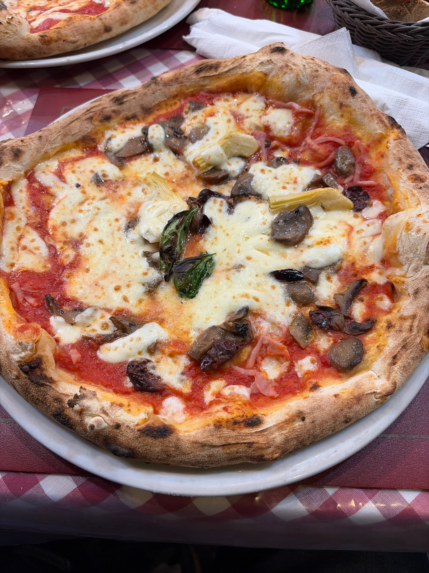 The image shows a pizza on a white plate, set on a red and white checkered tablecloth. The pizza has a Neapolitan style with a raised, slightly charred crust. The toppings include tomato sauce, mozzarβ¦read more