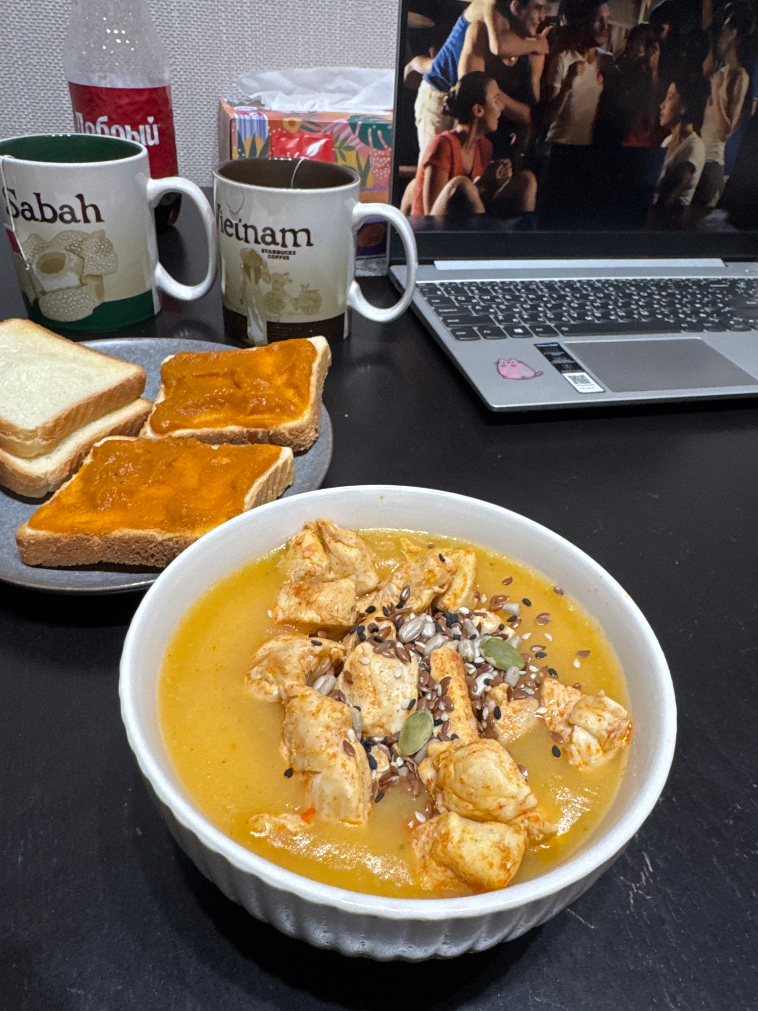 A table with various items is seen. The table surface appears to be a dark grey color. On the table are a laptop, two mugs, a plate with bread, and a bowl of soup with pieces of chicken and seeds on t…read more