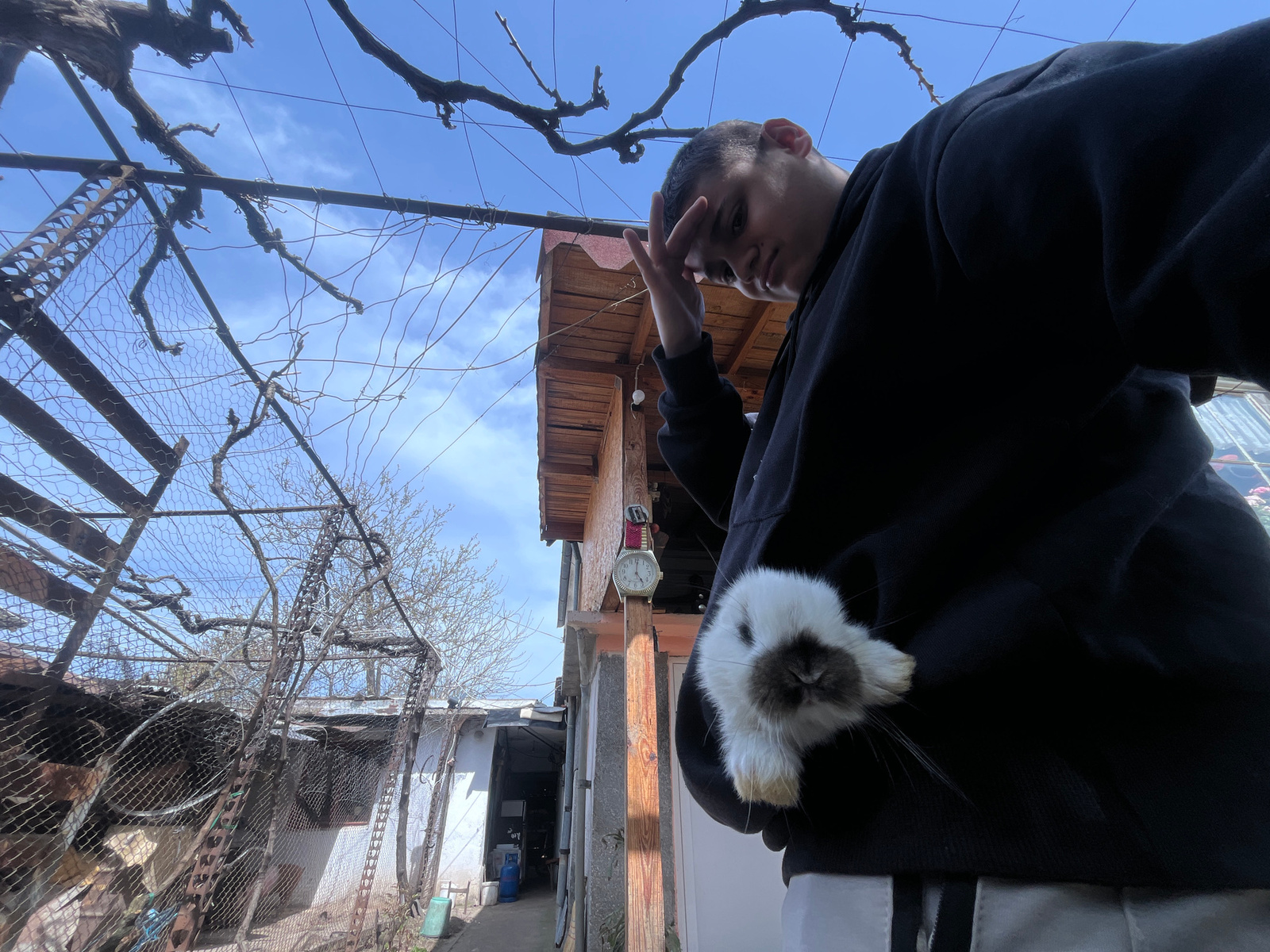 A low-angle shot captures a young male outdoors in Lozarevo, Bulgaria. He wears a black hoodie and light-colored pants. He holds a small white rabbit with a dark face and ears in the front of his hood…read more