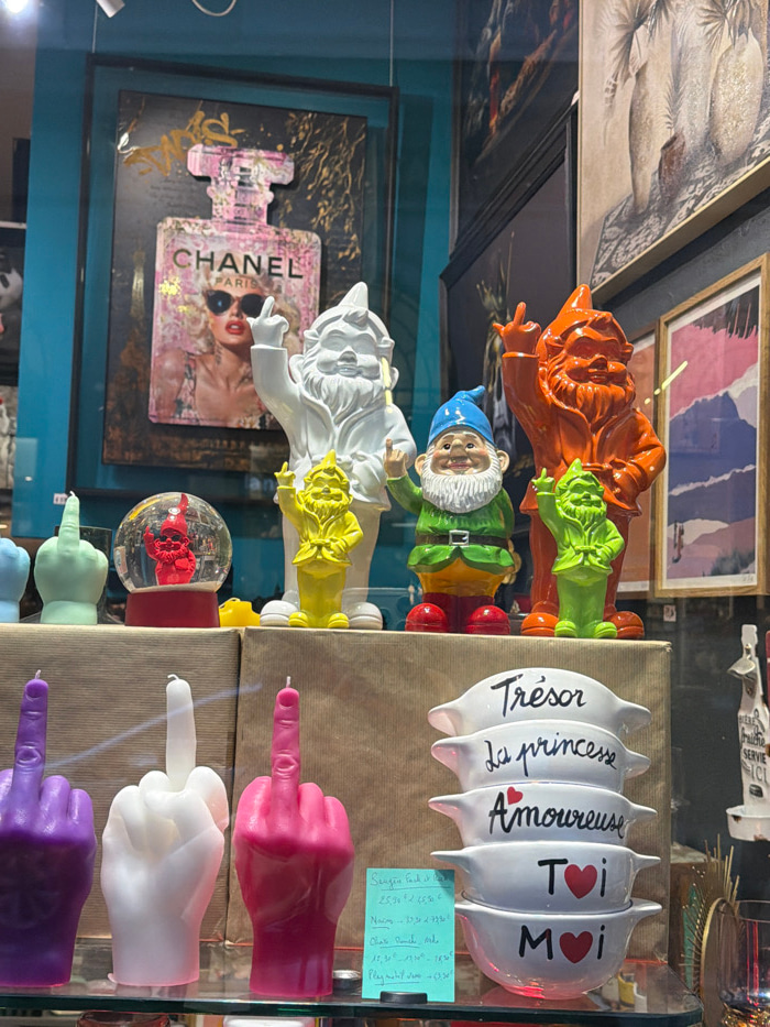 A quirky store display is featured in the image. Three rows of ceramic garden gnomes, painted in orange, blue, and white, are presented. Beside them, a set of five white, tongue-shaped objects with ro…read more