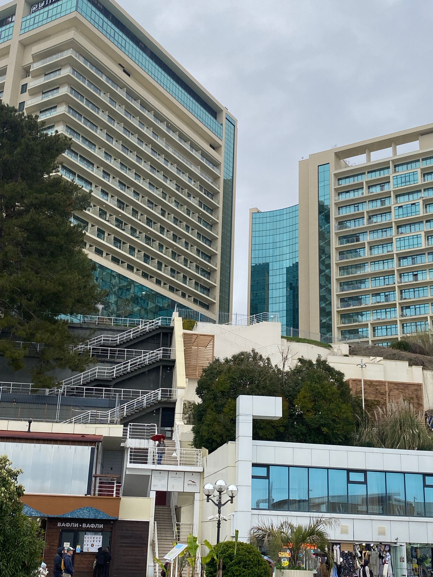 The image captures a street scene in Sochi, Russia, showcasing a blend of modern architecture and commercial activity. Two towering buildings dominate the view, each featuring a facade with numerous b…read more