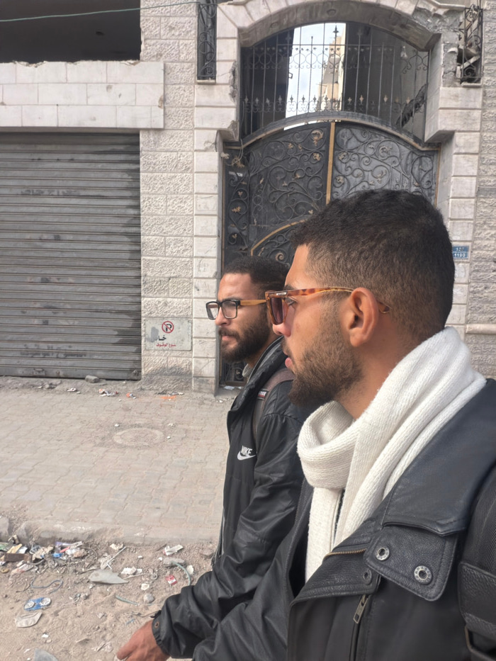The image depicts two adult males walking along an urban street in the city of Gaza, Palestinian Territory. Both men are viewed in profile, moving from left to right. The man in the foreground wears a…read more