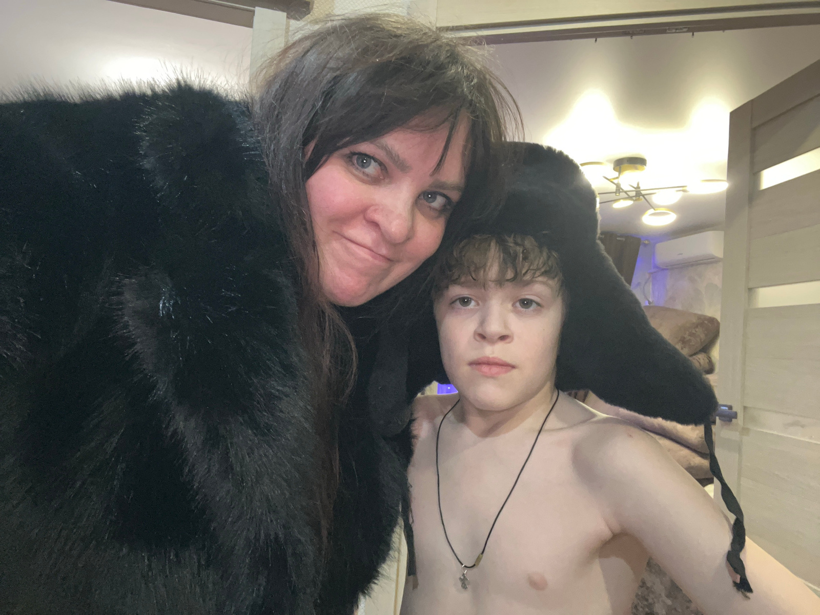 A selfie-style image depicts two individuals, one older woman and one younger person, within an interior setting. The woman, wearing a dark fur coat or similar garment, is closer to the camera and sli…read more