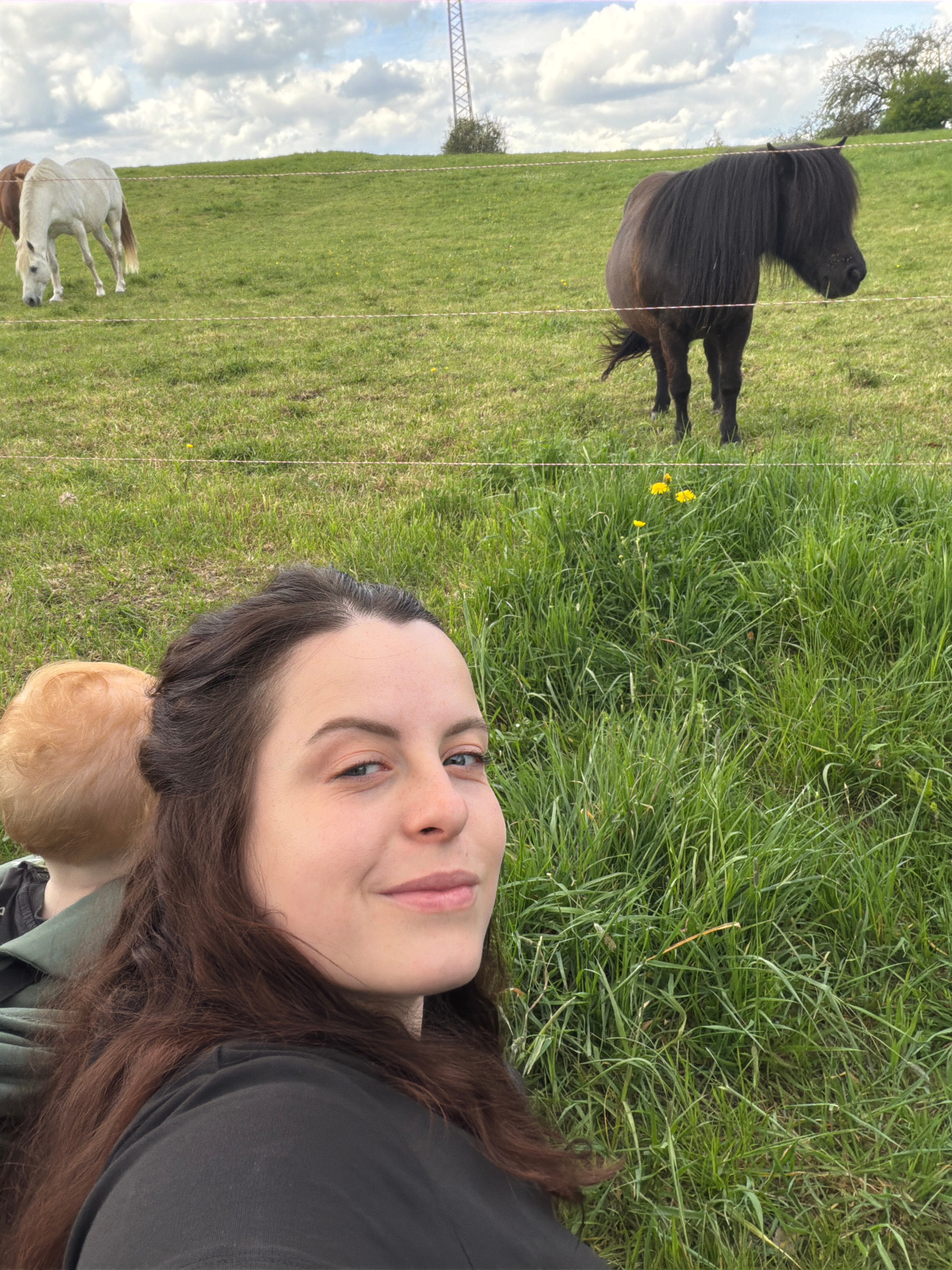 This media file is an outdoor portrait-style photograph, rotated 90 degrees counter-clockwise, depicting a young woman lying on her back in a grassy field with horses in the background. In the foregr…read more