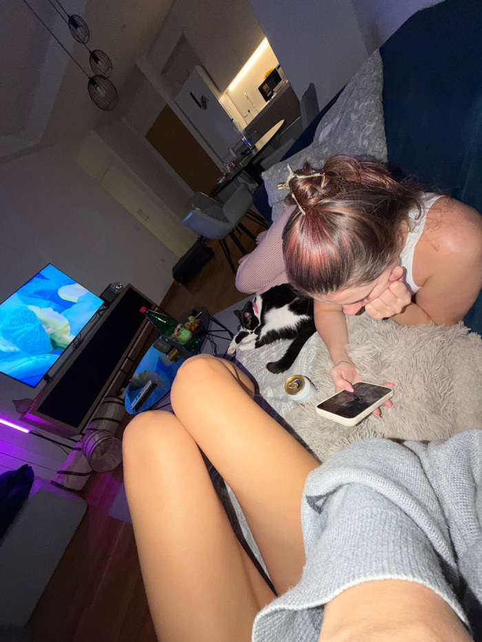 A casual scene unfolds, showcasing a woman reclining on a couch, engaged with her phone. A black and white cat rests beside her, adding to the relaxed atmosphere. A can of drink sits near the woman. I…read more