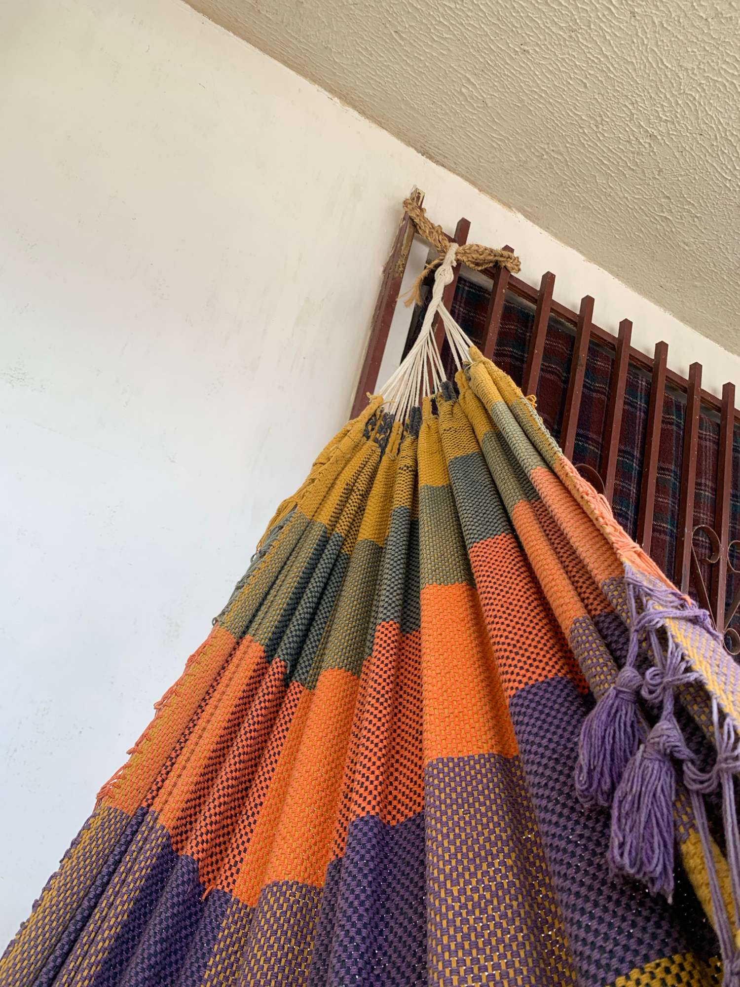 A low-angle, close-up shot shows a multi-colored hammock hung from a wooden structure. The hammock features alternating bands of purple, orange, yellow, and grey in a woven pattern. Purple tassels are…read more