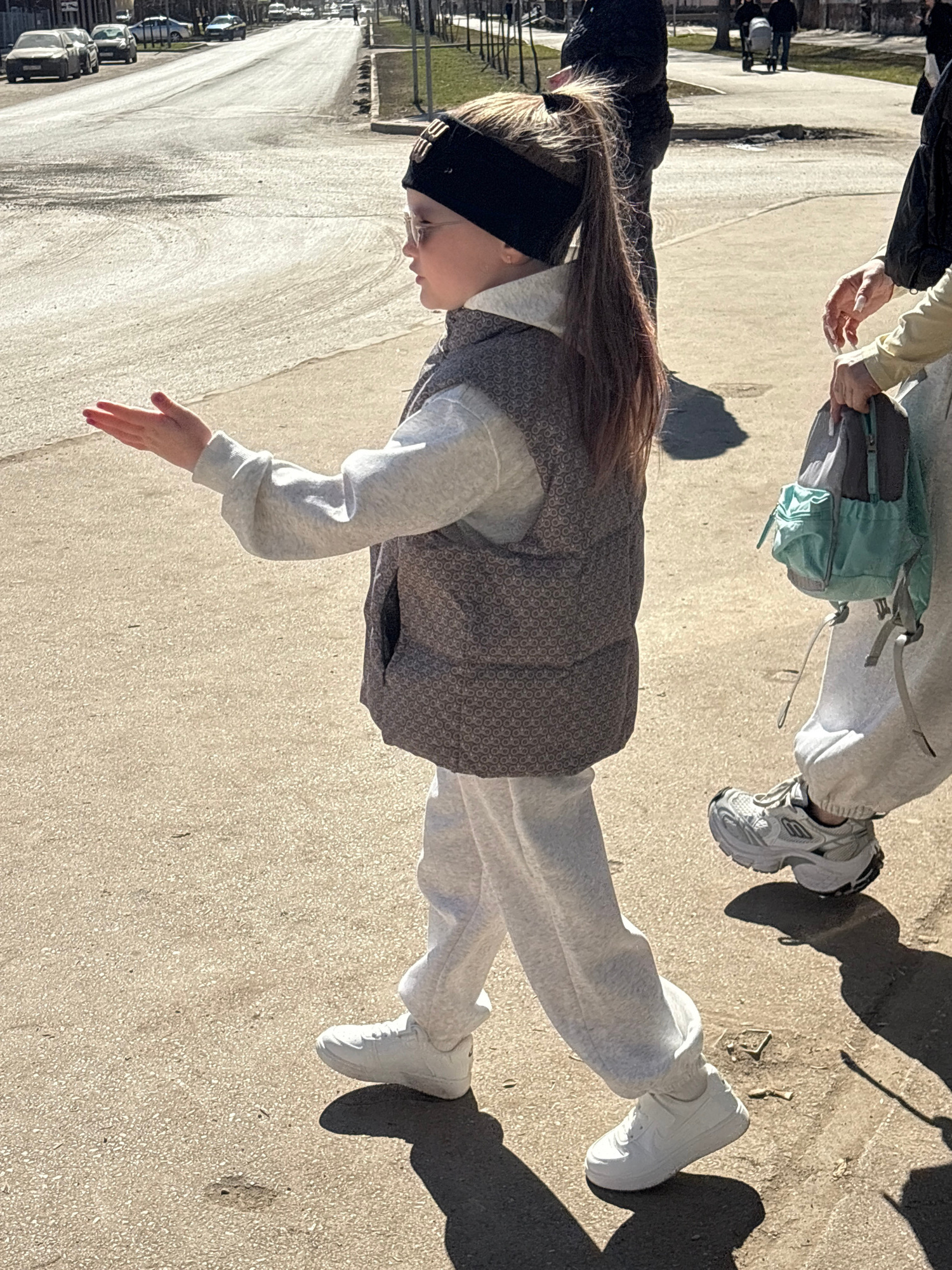 A young girl, seen from the chest up, stands on a sidewalk. She wears a black headband, a gray patterned vest, and a light gray sweatshirt and sweatpants, along with white sneakers. She extends her ri…read more
