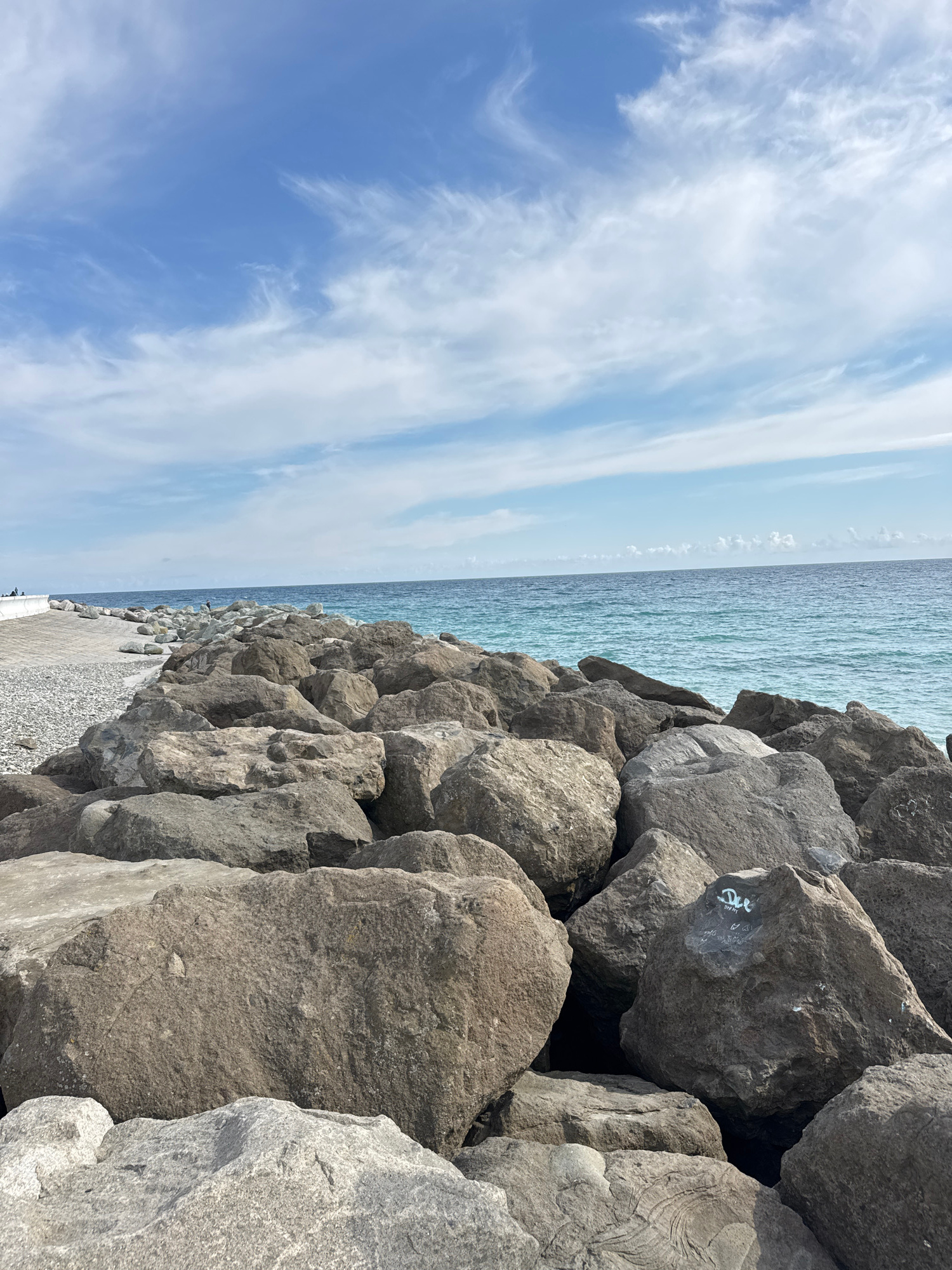 The image shows a rocky coastline on a sunny day. Large, gray rocks form a barrier, possibly a breakwater or shoreline protection. The sea is calm with a blue-green hue, transitioning to a lighter blu…read more
