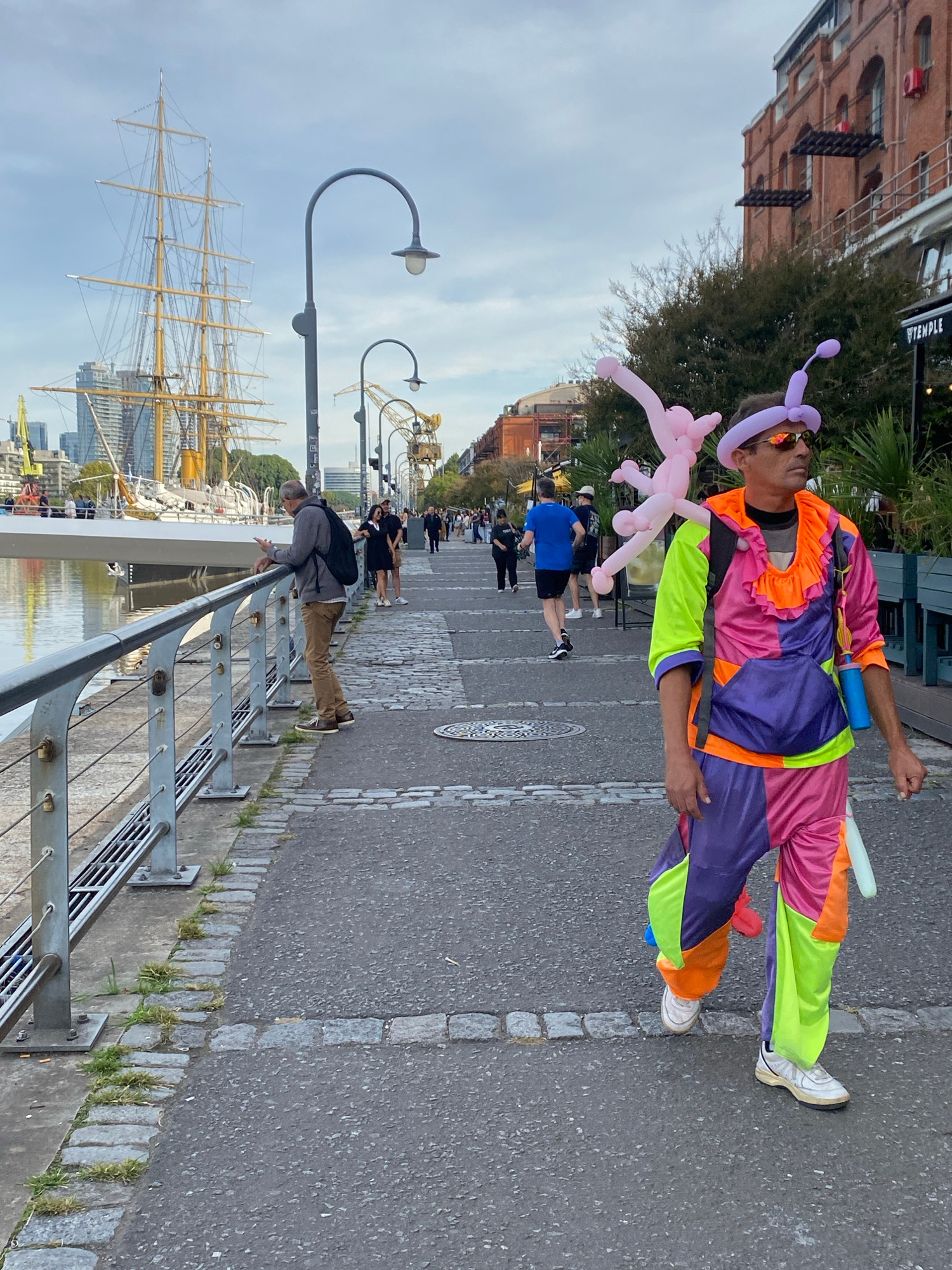 A man dressed in a colorful clown suit, with a balloon animal on his head and a pink balloon animal in his hand, is standing on a gray concrete sidewalk next to a metal railing. Other people are walki…read more