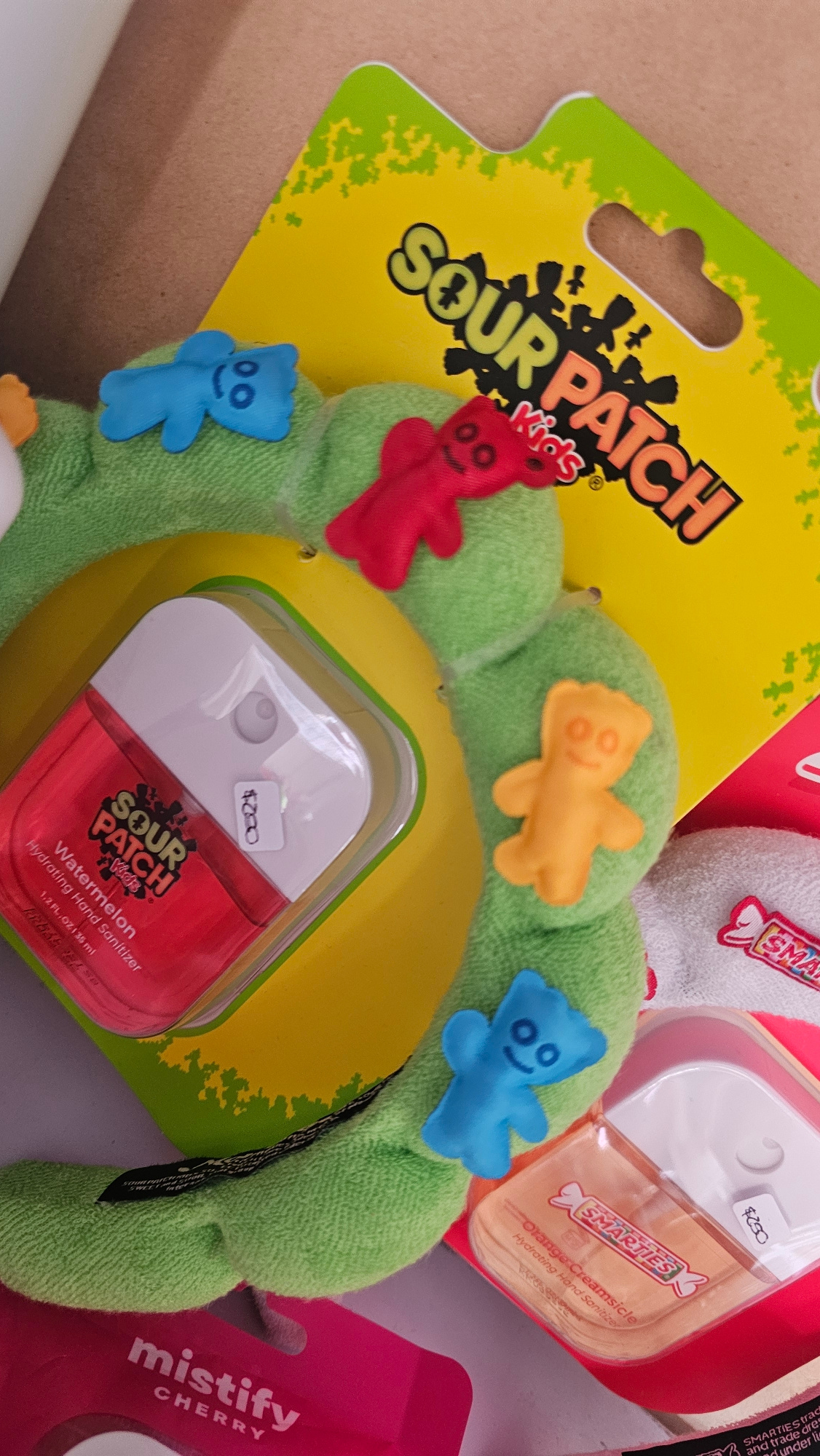 The image shows a variety of candy-themed personal care items. Included are: Sour Patch Kids hand sanitizer (watermelon scented), Smarties hand sanitizer (orange creamsicle scented), and a mistify cheβ¦read more