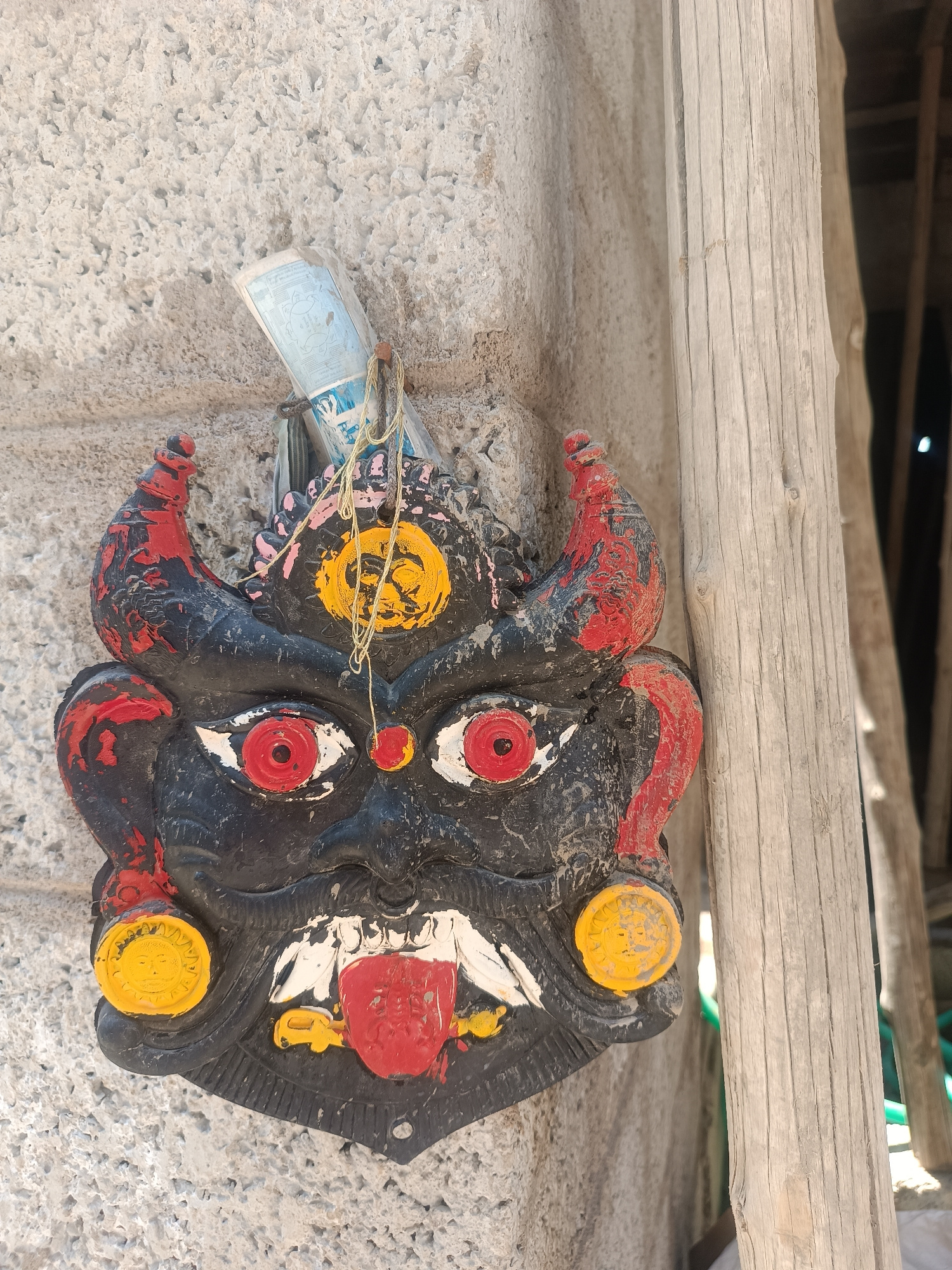 A weathered, multi-colored, horned mask is affixed to a textured, light-grey wall in Pedda Kammavaripalli, India. The mask, predominantly black, features red horns, red eyes with white sclera, a protrβ¦read more