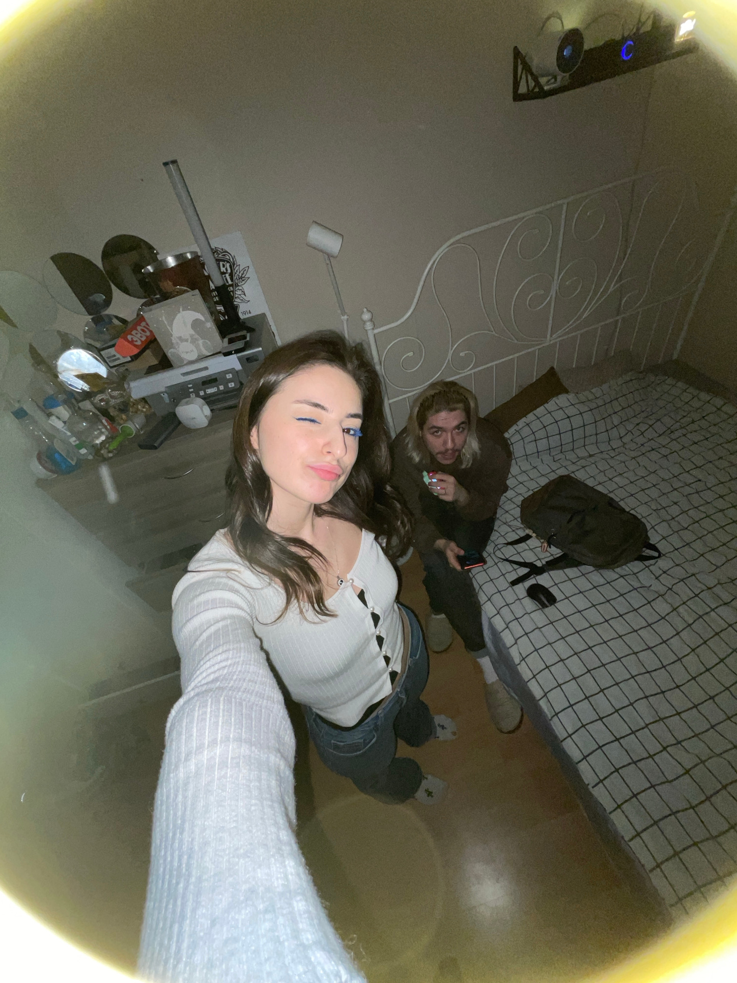 Two people are in a room with hardwood floors and a bed with a gray and white checkered blanket and a white metal frame. A woman with long brown hair, wearing a white long-sleeved shirt and blue jeans…read more