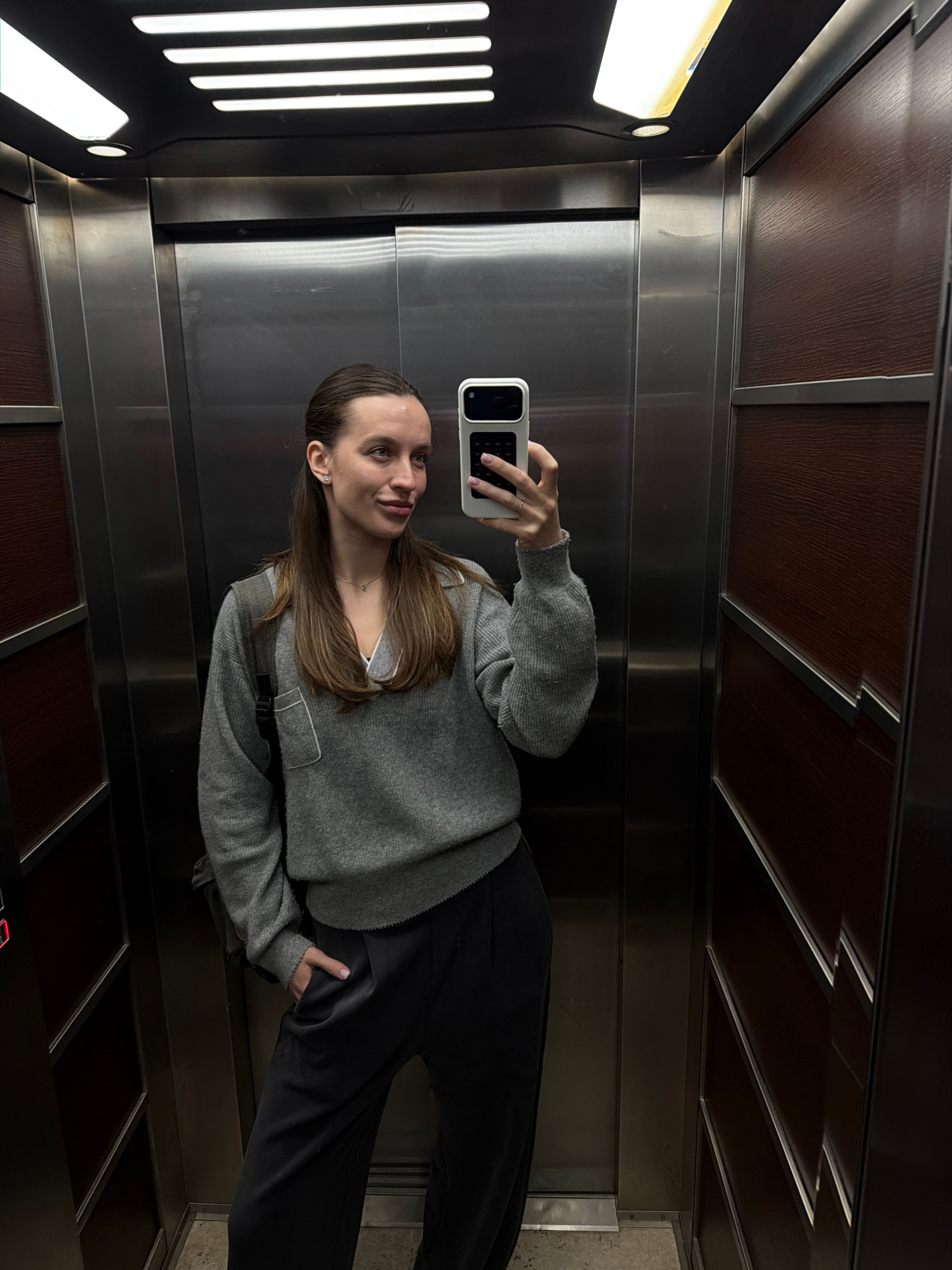 A woman is taking a selfie in an elevator. She is wearing a gray sweater and black pants. The elevator has stainless steel walls and a brown wood-paneled ceiling. The lighting is bright. The photo was…read more