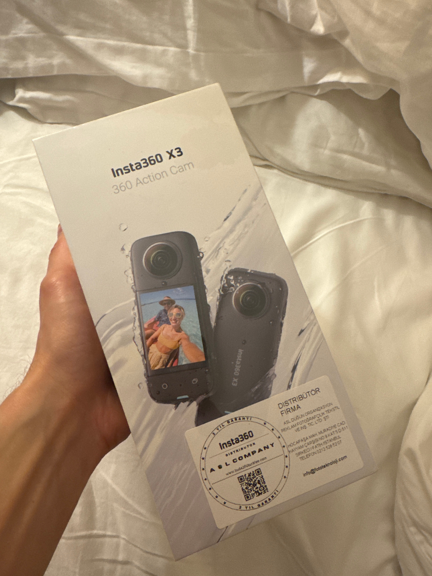 A close-up shot shows a hand holding a box of Insta360 X3 360 Action Cam, against a background of crumpled white bedding. The box displays an image of the camera with a woman on its screen. The box al…read more