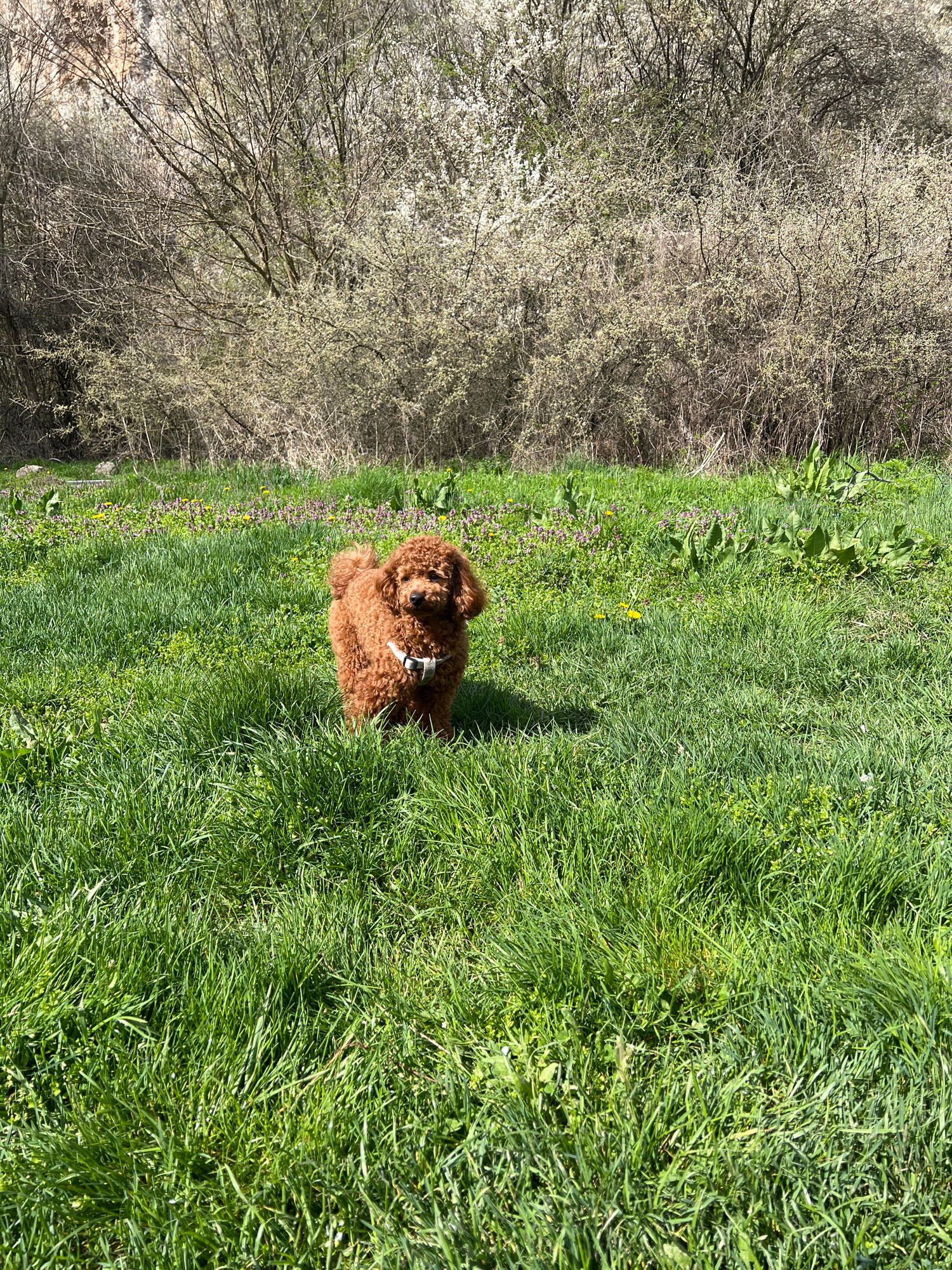 A brown poodle with a white collar is sitting in a field of green grass with purple and yellow wildflowers. The field is bordered by trees with white blossoms. The image was taken in Gortalovo, Bulgar…read more
