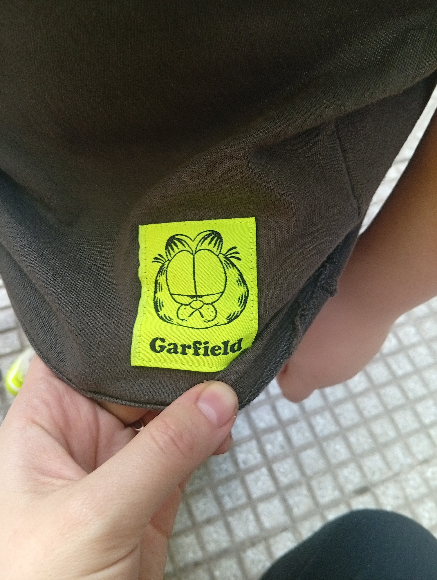 A hand holds the edge of a dark gray/brown garment with a neon green Garfield patch. The patch features a black-outlined cartoon image of Garfield's face and the name "Garfield" printed below. The bac…read more