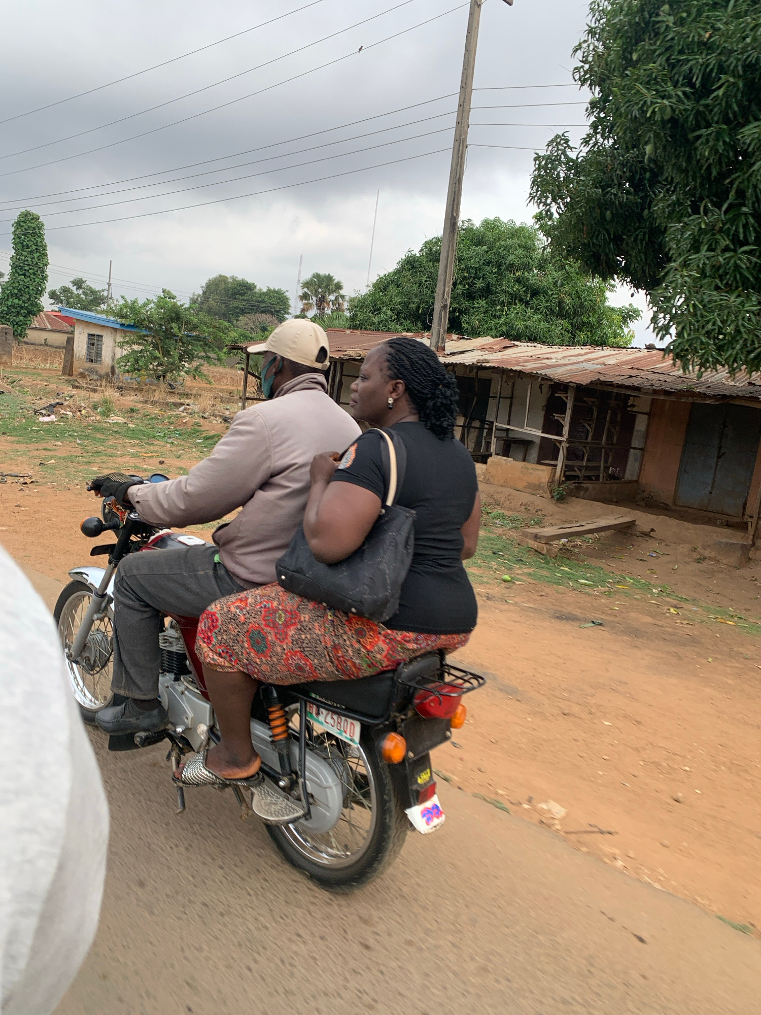Two individuals are riding a motorcycle on a dirt road in the city of Maigizo, Nigeria. The driver wears a light brown jacket, black gloves, dark pants, and a tan baseball cap. The passenger, seated b…read more