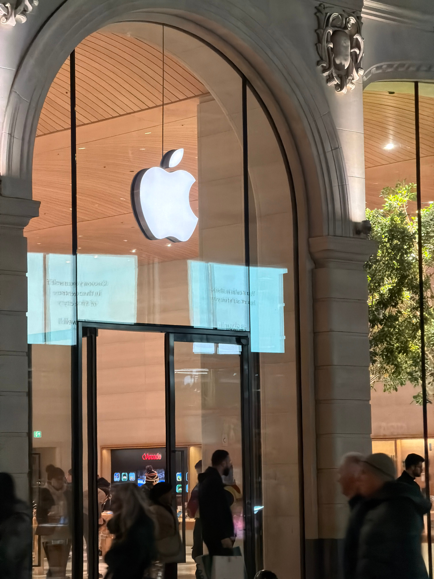 Captured from an exterior vantage point at night, the image showcases an Apple Store nestled in London, United Kingdom. The store front, characterized by a prominent archway adorned with intricate mol…read more