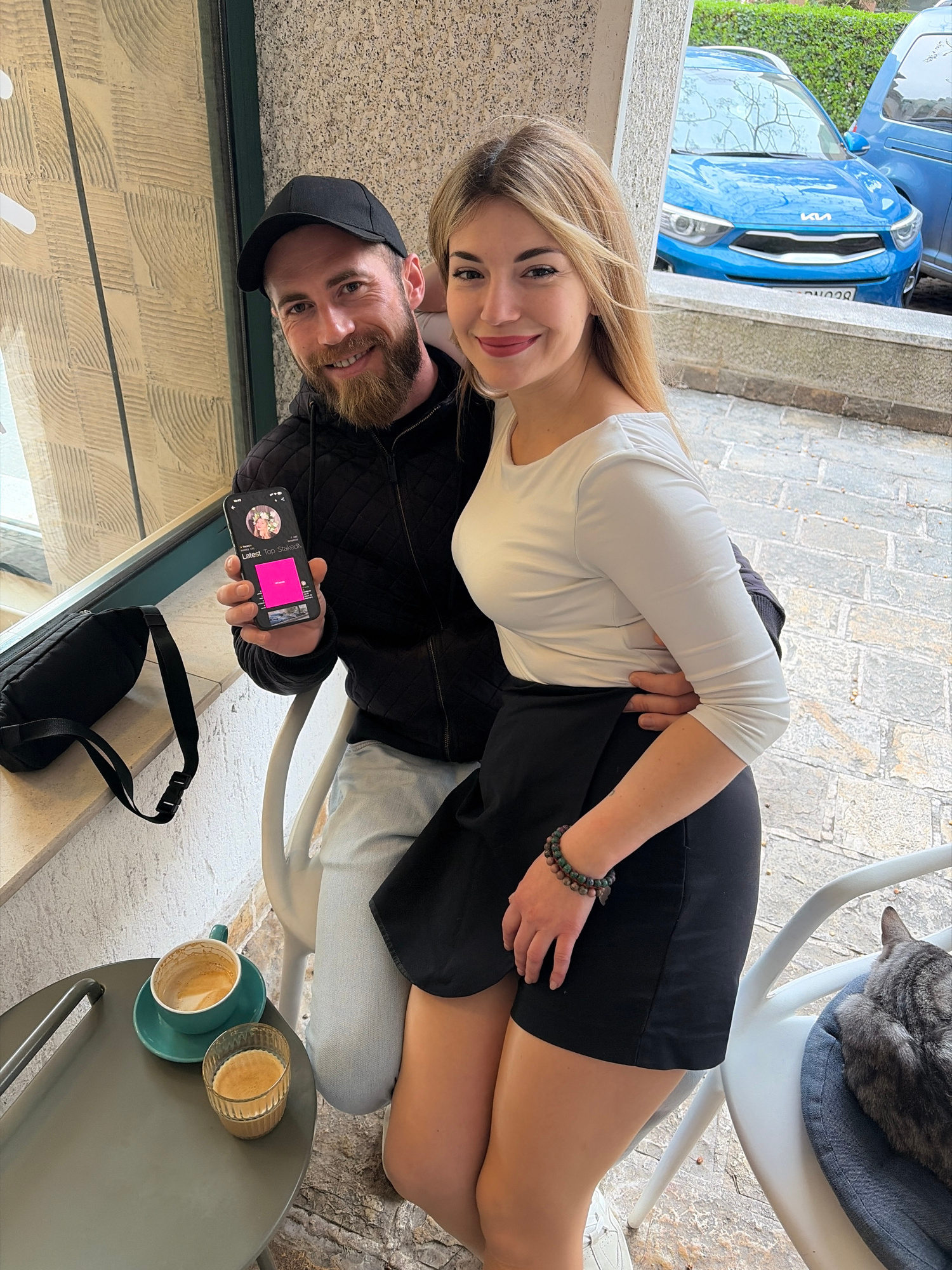 The photograph captures a man and a woman posing closely together at an outdoor café in Budva, Montenegro. The woman, with blonde hair and a bright smile, is wearing a white long-sleeved shirt and a s…read more